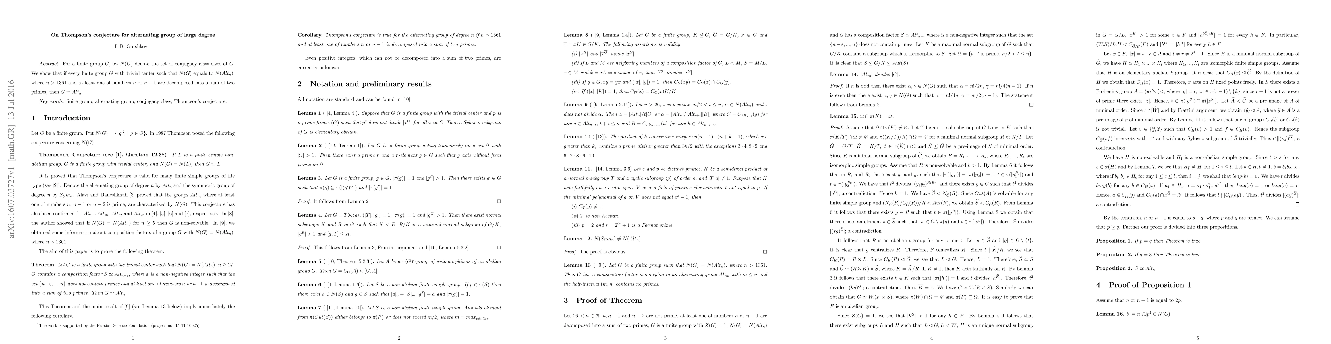 For a finite group $G$, let $N(G)$ denote the set of conjugacy class sizes of $G$. We show that if every finite group $G$ with trivial center such that $N(G)$ equals to $N(Alt_n)$, where $n>1361$ and at least one of numbers $n$ or $n-1$ are decomposed into a sum of two primes, then $G\simeq Alt_n$.