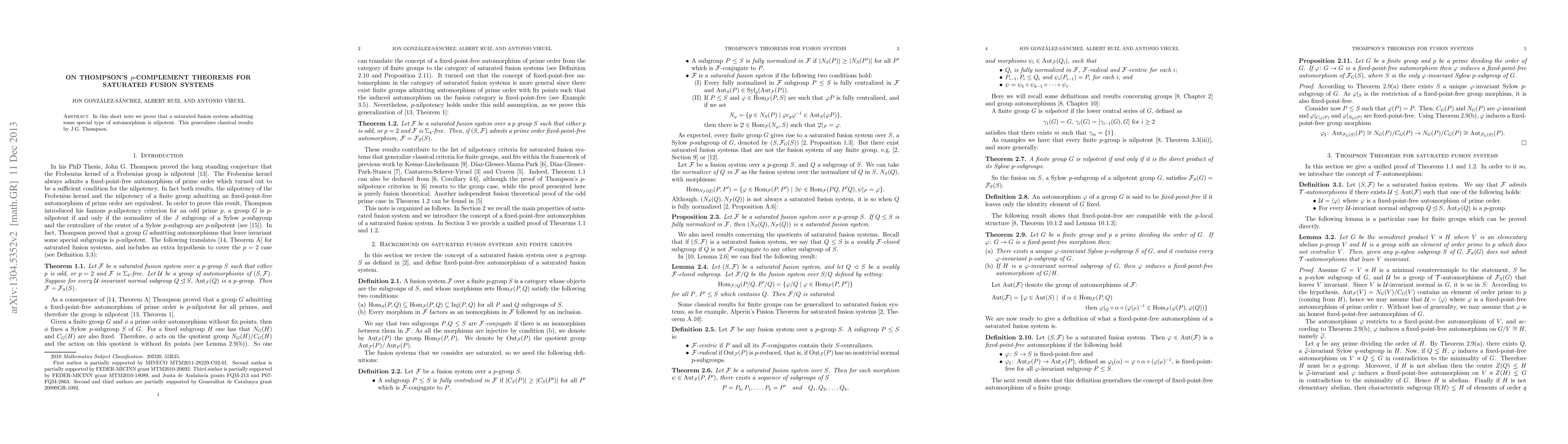 In this short note we prove that a saturated fusion system admitting some special type of automorphism is nilpotent. This generalizes classical results by J.G. Thompson.