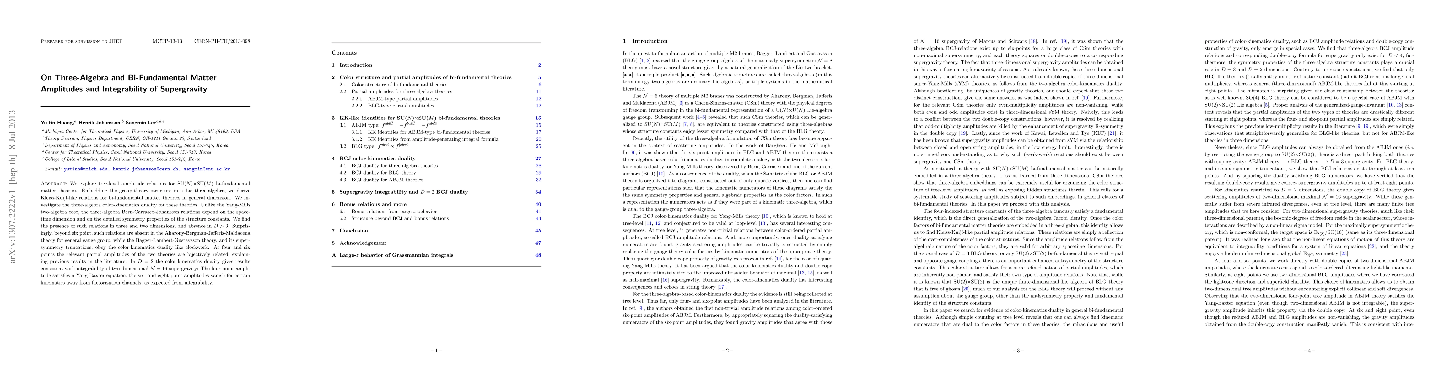 We explore tree-level amplitude relations for SU(N)xSU(M) bi-fundamental matter theories. Embedding the group-theory structure in a Lie three-algebra, we derive Kleiss-Kuijf-like relations for bi-fundamental matter theories in general dimension. We investigate the three-algebra color-kinematics duality for these theories. Unlike the Yang-Mills two-algebra case, the three-algebra Bern-Carrasco-Johansson relations depend on the spacetime dimension and on the detailed symmetry properties of the structure constants. We find the presence of such relations in three and two dimensions, and absence in D>3. Surprisingly, beyond six point, such relations are absent in the Aharony-Bergman-Jafferis-Maldacena theory for general gauge group, while the Bagger-Lambert-Gustavsson theory, and its supersymmetry truncations, obey the color-kinematics duality like clockwork. At four and six points the relevant partial amplitudes of the two theories are bijectively related, explaining previous results in the literature. In D=2 the color-kinematics duality gives results consistent with integrability of two-dimensional $\mathcal{N}=16$ supergravity: The four-point amplitude satisfies a Yang-Baxter equation; the six- and eight-point amplitudes vanish for certain kinematics away from factorization channels, as expected from integrability.