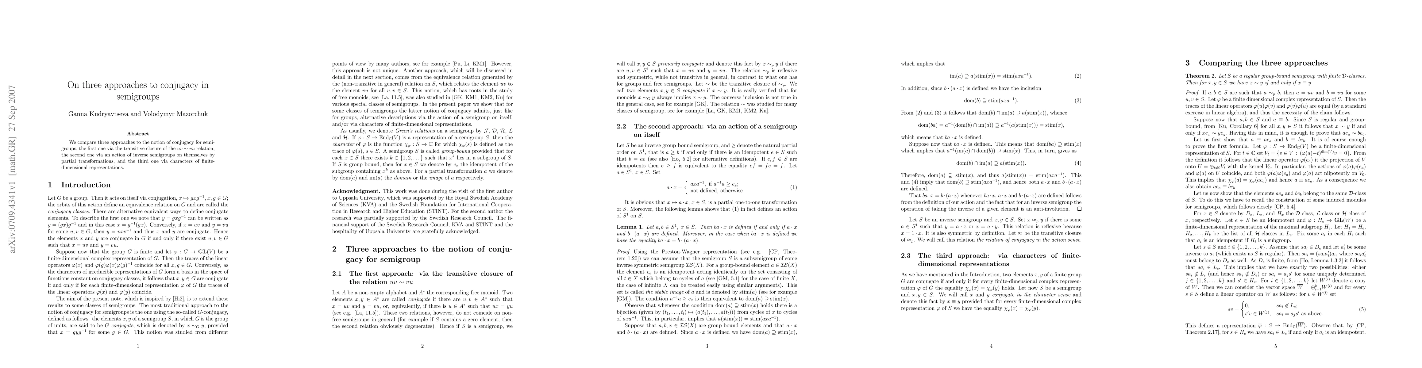 Summary: This paper compares three distinct methods for defining conjugacy in semigroups: one through the transitive closure of the $uv\sim vu$ relation, another through an action of inverse semigroups via partial transformations, and the third using characters from finite-dimensional representations.