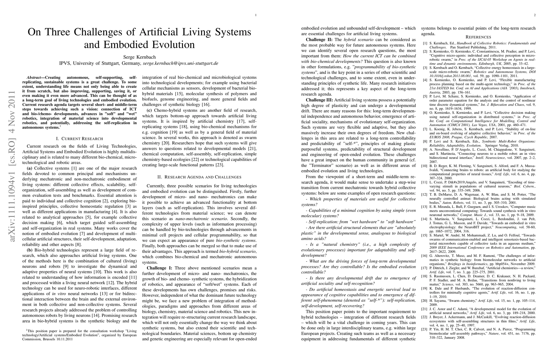 Creating autonomous, self-supporting, self-replicating, sustainable systems is a great challenge. To some extent, understanding life means not only being able to create it from scratch, but also improving, supporting, saving it, or even making it even more advanced. This can be thought of as a long-term goal of living technologies and embodied evolution. Current research agenda targets several short- and middle-term steps towards achieving such a vision: connection of ICT and bio-/chemo- developments, advances in "soft" and "wet" robotics, integration of material science into developmental robotics, and potentially, addressing the self-replication in autonomous systems.
