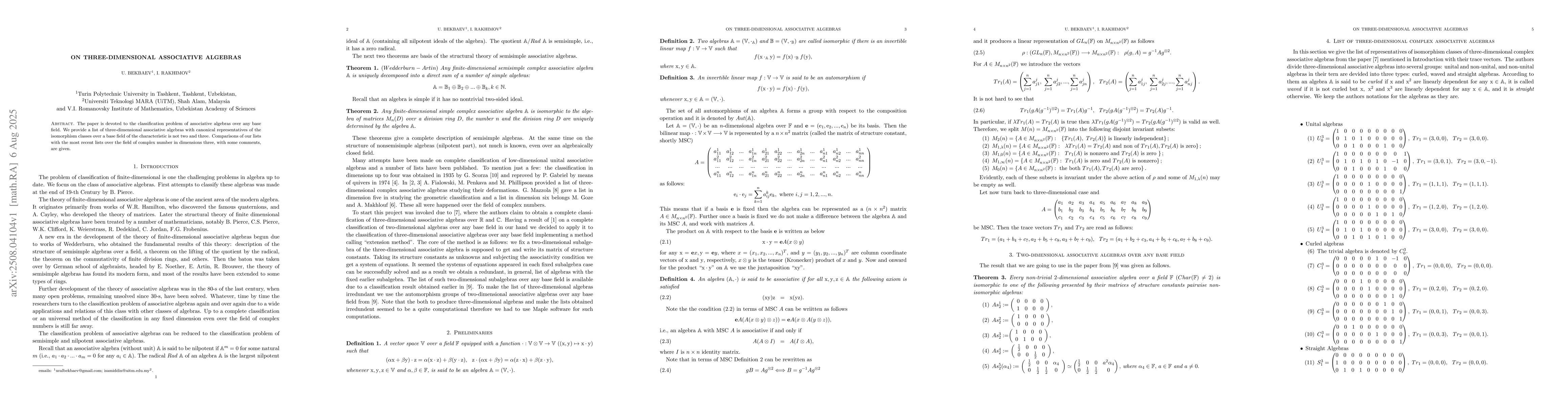 The paper is devoted to the classification problem of associative algebras over any base field. We provide a list of three-dimensional associative algebras with canonical representatives of the isomorphism classes over a base field of the characteristic is not two and three. Comparisons of our lists with the most recent lists over the field of complex number in dimensions three, with some comments, are given.