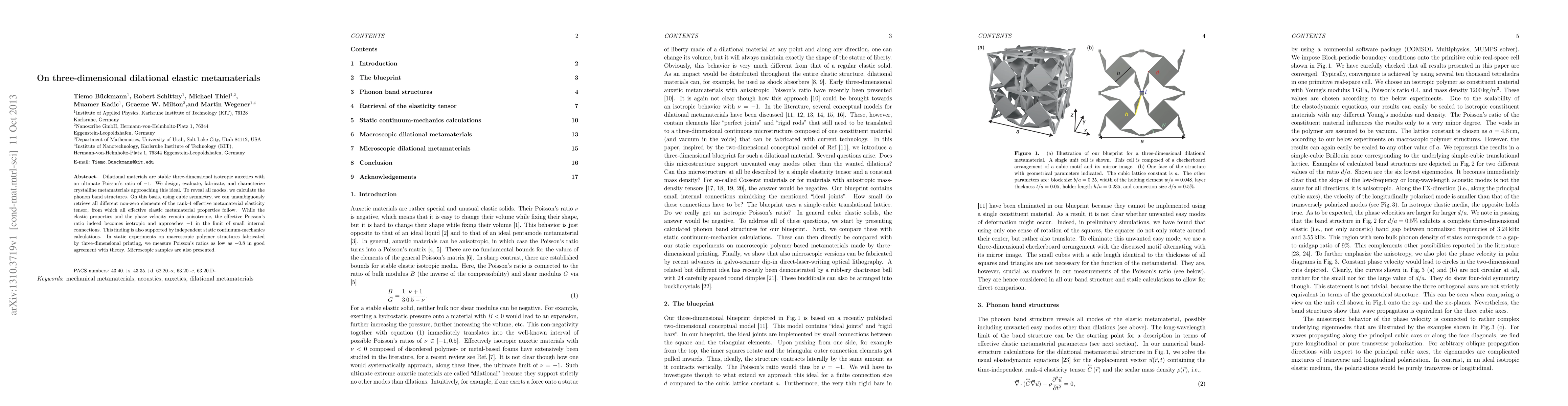 Dilational materials are stable three-dimensional isotropic auxetics with an ultimate Poisson's ratio of -1. We design, evaluate, fabricate, and characterize crystalline metamaterials approaching this ideal. To reveal all modes, we calculate the phonon band structures. On this basis, using cubic symmetry, we can unambiguously retrieve all different non-zero elements of the rank-4 effective metamaterial elasticity tensor, from which all effective elastic metamaterial properties follow. While the elastic properties and the phase velocity remain anisotropic, the effective Poisson's ratio indeed becomes isotropic and approaches -1 in the limit of small internal connections. This finding is also supported by independent static continuum-mechanics calculations. In static experiments on macroscopic polymer structures fabricated by three-dimensional printing, we measure Poisson's ratios as low as -0.8 in good agreement with theory. Microscopic samples are also presented.