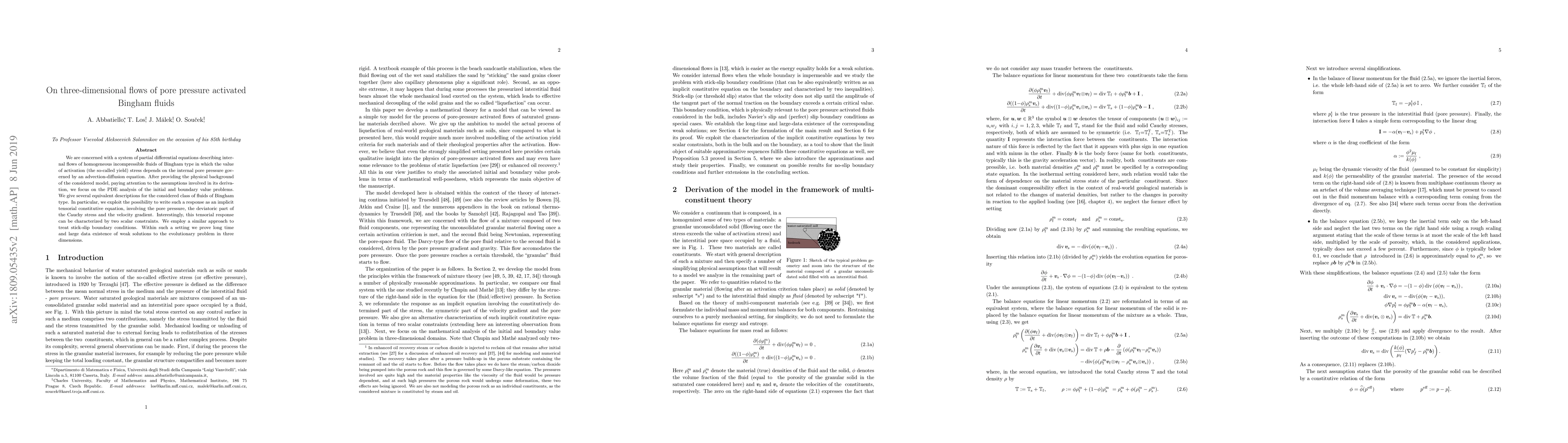 This paper investigates the mathematical modeling of three-dimensional flows of Bingham fluids where the yield stress is influenced by pore pressure, governed by an advection-diffusion equation. The authors provide a PDE analysis of the initial and boundary value problems, proving the existence of weak solutions over long time scales and large data sets.