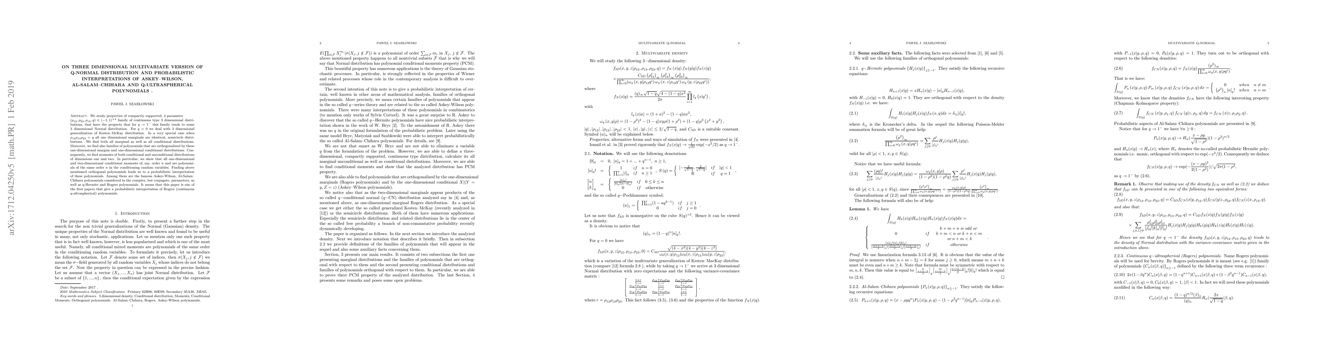 We study properties of compactly supported, 4 parameter \newline $(\rho _{12},\rho _{23},\rho _{13},q)\in (-1,1)^{\times 4}$ family of continuous type 3 dimensional distributions, that have the property that for $q\rightarrow 1^{-}$ this family tends to some 3 dimensional Normal distribution. For $q=0$ we deal with 3 dimensional generalization of Kesten--McKay distribution. In a very special case when $\rho _{12}\rho _{13}\rho _{23}=q$ all one dimensional marginals are identical, semicircle distributions. We find both all marginal as well as all conditional distributions. Moreover, we find also families of polynomials that are orthogonalized by these one-dimensional margins and one-dimensional conditional distributions. Consequently, we find moments of both conditional and unconditional distributions of dimensions one and two. In particular, we show that all one-dimensional and two-dimensional conditional moments of, say, order $n$ and are polynomials of the same order $n$ in the conditioning random variables. Finding above mentioned orthogonal polynomials leads us to a probabilistic interpretation of these polynomials. Among them are the famous Askey-Wilson, Al-Salam--Chihara polynomials considered in the complex, but conjugate, parameters, as well as q-Hermite and Rogers polynomials. It seems that this paper is one of the first papers that give a probabilistic interpretation of Rogers (continuous q-ultraspherical) polynomials.