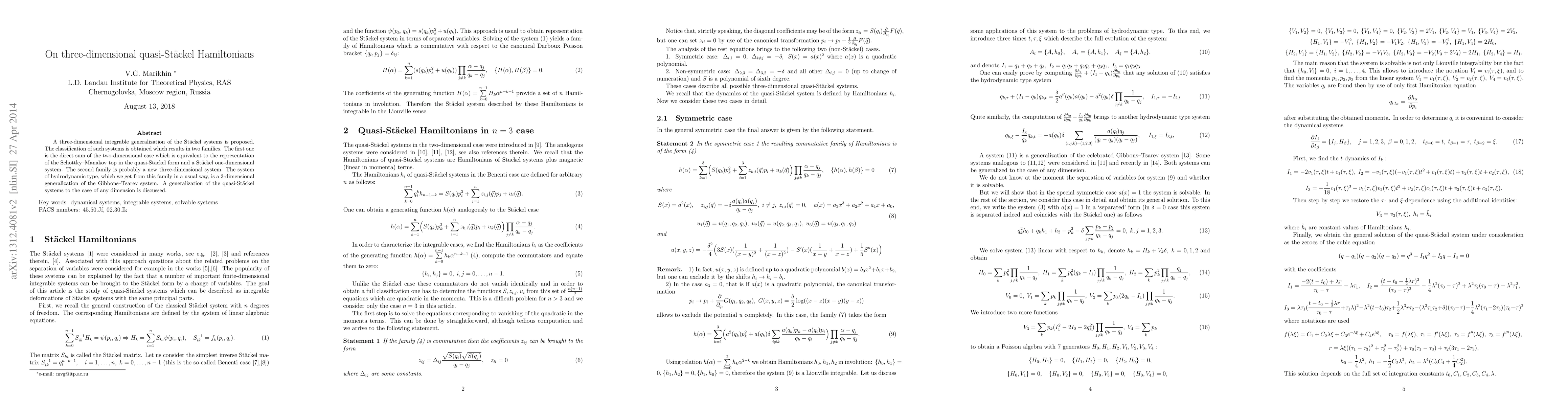 A three-dimensional integrable generalization of the St\"ackel systems is proposed. The classification of such systems is obtained which results in two families. The first one is the direct sum of the two-dimensional case which is equivalent to the representation of the Schottky--Manakov top in the quasi-St\"ackel form and a trivial one-dimensional system. The second family is probably a new three-dimensional system. The system of hydrodynamic type, which we get from this family in a usual way, is a 3-dimensional generalization of the Gibbons--Tsarev system. A generalization of the quasi-St\"ackel systems to the case of any dimension is discussed.
