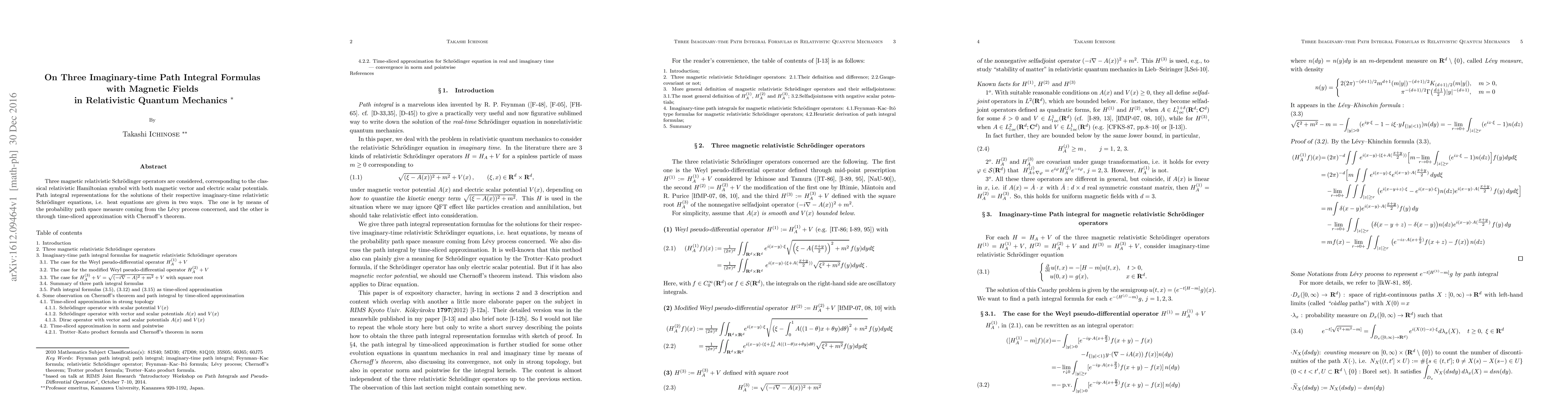 This paper presents path integral representations for three magnetic relativistic Schrödinger operators, derived using both L\'evy process probability measures and Chernoff's theorem for time-sliced approximations. These representations solve the corresponding imaginary-time relativistic Schrödinger equations, or heat equations.