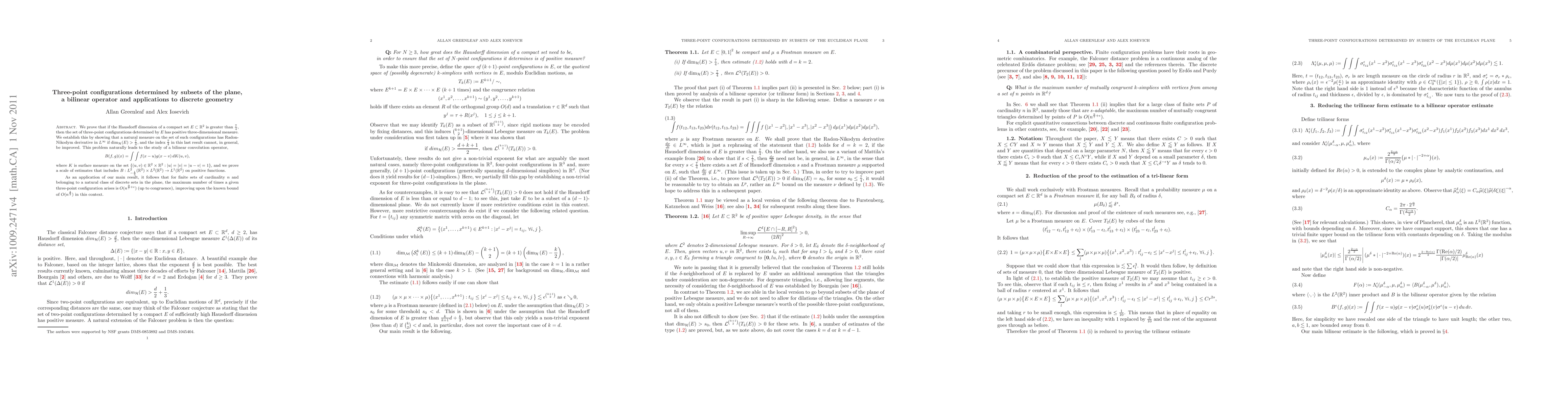 We prove that if the Hausdorff dimension of a compact set $E \subset {\Bbb R}^2$ is greater than 7/4, then the set of {\ag three-point configurations determined by $E$ has positive three-dimensional measure}. We establish this by showing that {\ag a} natural measure on the set of {\ag such configurations} has {\ag Radon-Nikodym derivative} in $L^{\infty}$ if $\dH(E)> 7/4$, and the index 7/4 in this last result cannot, in general, be improved. This problem naturally leads to the study of a bilinear convolution operator, $$ B(f,g)(x)=\int \int f(x-u) g(x-v)\, dK(u,v),$$ where $K$ is surface measure on the set $ \{(u, v) \in\R^2 \times \R^2: |u|=|v|=|u-v|=1\}$, and we prove a scale of estimates that includes $B:L^2_{-1/2}({\Bbb R}^2) \times L^2({\Bbb R}^2) \to L^1({\Bbb R}^2)$ on positive functions. As an application of our main result, it follows that {\ag for finite sets of cardinality $n$ and belonging to a natural class of discrete sets in the plane}, the maximum number of times a given three-point configuration arises is $O(n^{9/7+\epsilon})$ (up to congruence), improving upon the known bound of $O(n^{4/3})$ in this context.