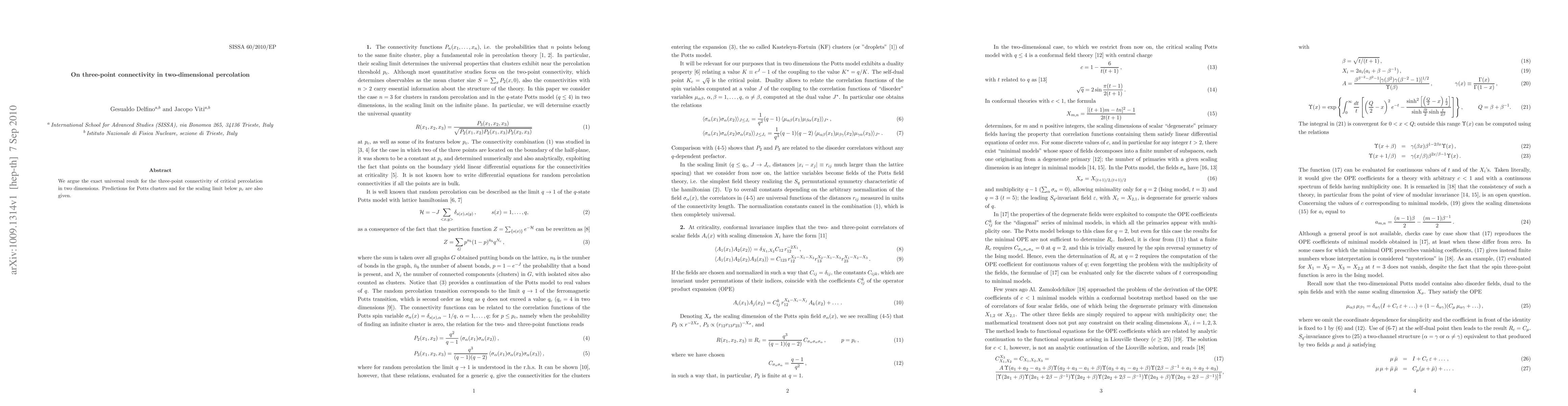 Summary: This paper establishes the precise universal result for three-point connectivity in critical two-dimensional percolation, and extends predictions to Potts clusters and the scaling limit below the critical threshold p_c.