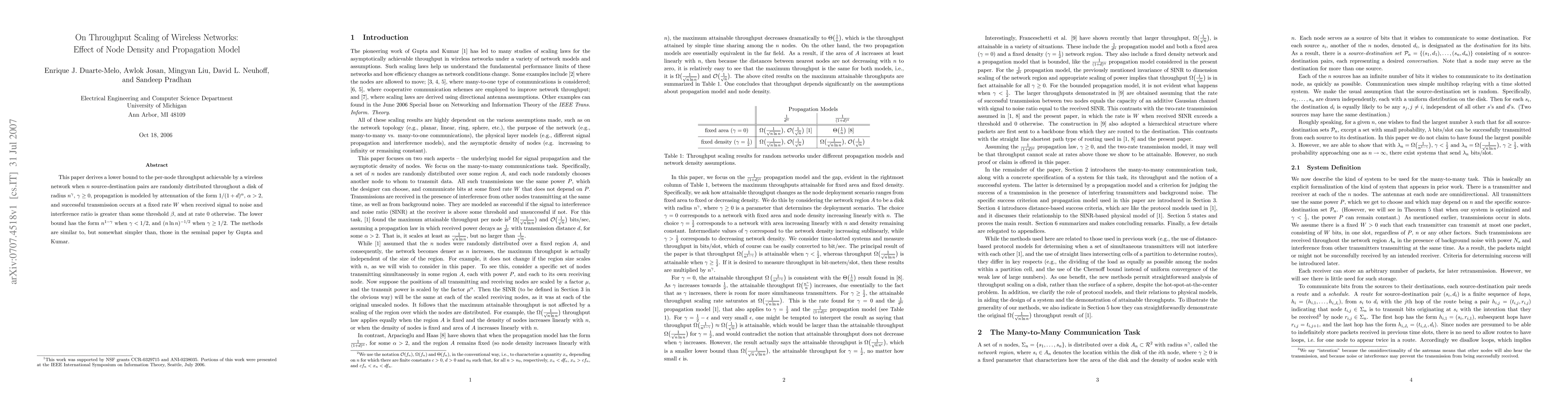 This paper derives a lower bound to the per-node throughput achievable by a wireless network when n source-destination pairs are randomly distributed throughout a disk of radius $n^\gamma$, $ \gamma \geq 0$, propagation is modeled by attenuation of the form $1/(1+d)^\alpha$, $\alpha >2$, and successful transmission occurs at a fixed rate W when received signal to noise and interference ratio is greater than some threshold $\beta$, and at rate 0 otherwise. The lower bound has the form $n^{1-\gamma}$ when $\gamma < 1/2$, and $(n \ln n)^{-1/2}$ when $\gamma \geq 1/2$. The methods are similar to, but somewhat simpler than, those in the seminal paper by Gupta and Kumar.