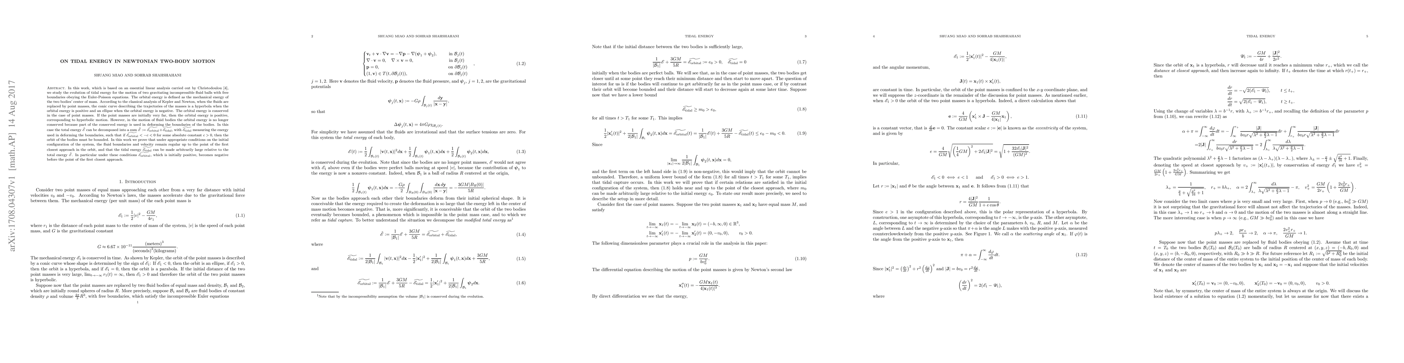 In this work, which is based on an essential linear analysis carried out by Christodoulou, we study the evolution of tidal energy for the motion of two gravitating incompressible fluid balls with free boundaries obeying the Euler-Poisson equations. The orbital energy is defined as the mechanical energy of the two bodies' center of mass. According to the classical analysis of Kepler and Newton, when the fluids are replaced by point masses, the conic curve describing the trajectories of the masses is a hyperbola when the orbital energy is positive and an ellipse when the orbital energy is negative. The orbital energy is conserved in the case of point masses. If the point masses are initially very far, then the orbital energy is positive, corresponding to hyperbolic motion. However, in the motion of fluid bodies the orbital energy is no longer conserved because part of the conserved energy is used in deforming the boundaries of the bodies. In this case the total energy $\tilde{\mathcal{E}}$ can be decomposed into a sum $\tilde{\mathcal{E}}:=\widetilde{\mathcal{E}_{{\mathrm{orbital}}}}+\widetilde{\mathcal{E}_{{\mathrm{tidal}}}}$, with $\widetilde{\mathcal{E}_{{\mathrm{tidal}}}}$ measuring the energy used in deforming the boundaries, such that if $\widetilde{\mathcal{E}_{{\mathrm{orbital}}}}<-c<0$ for some absolute constant $c>0$, then the orbit of the bodies must be bounded. In this work we prove that under appropriate conditions on the initial configuration of the system, the fluid boundaries and velocity remain regular up to the point of the first closest approach in the orbit, and that the tidal energy $\widetilde{\mathcal{E}_{{\mathrm{tidal}}}}$ can be made arbitrarily large relative to the total energy $\tilde{\mathcal{E}}$. In particular under these conditions $\widetilde{\mathcal{E}_{{\mathrm{orbital}}}}$, which is initially positive, becomes negative before the point of the first closest approach.