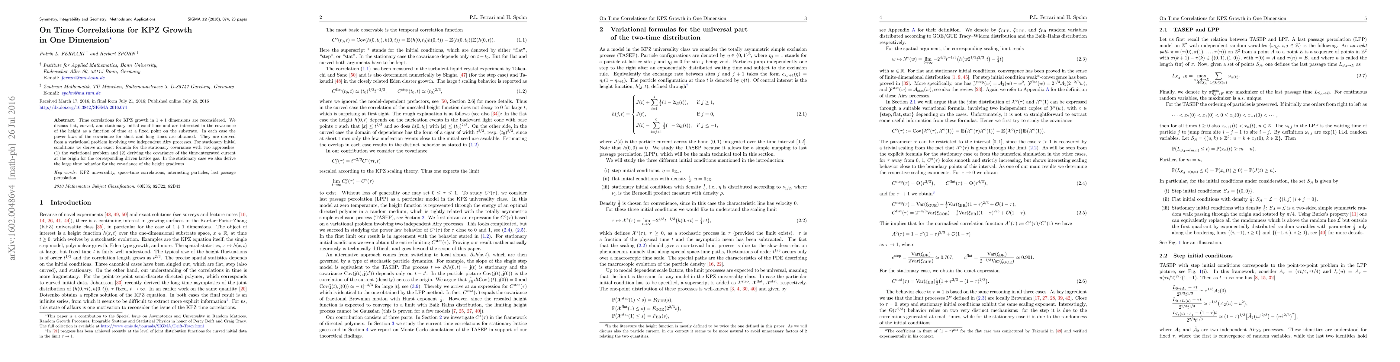 Time correlations for KPZ growth in 1+1 dimensions are reconsidered. We discuss flat, curved, and stationary initial conditions and are interested in the covariance of the height as a function of time at a fixed point on the substrate. In each case the power laws of the covariance for short and long times are obtained. They are derived from a variational problem involving two independent Airy processes. For stationary initial conditions we derive an exact formula for the stationary covariance with two approaches: (1) the variational problem and (2) deriving the covariance of the time-integrated current at the origin for the corresponding driven lattice gas. In the stationary case we also derive the l arge time behavior for the covariance of the height gradients.