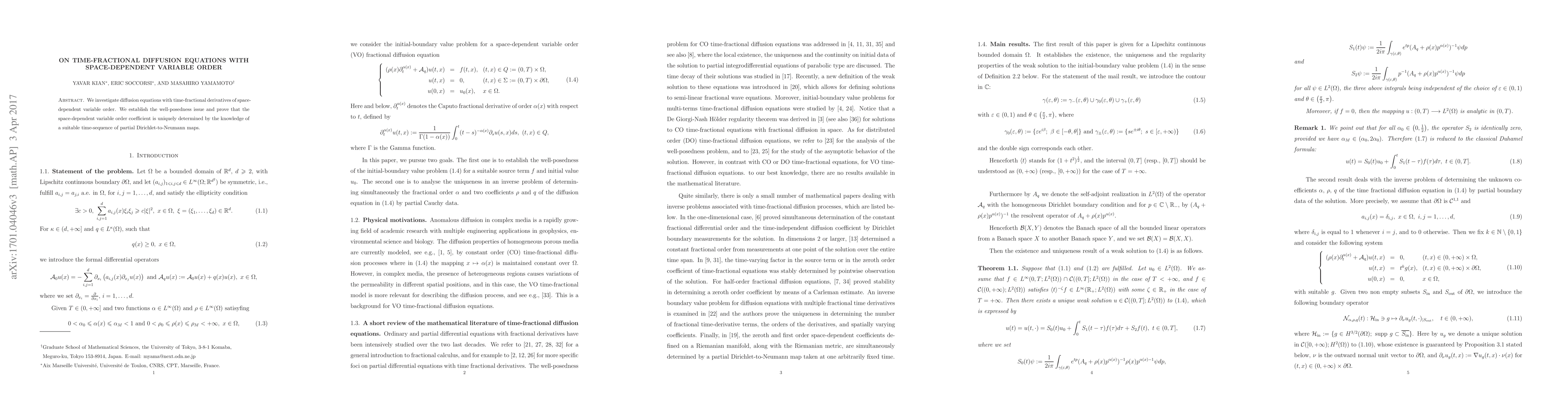 This paper explores time-fractional diffusion equations featuring space-dependent variable orders. It establishes the well-posedness of these equations and demonstrates that the variable order coefficient can uniquely be determined using a sequence of partial Dirichlet-to-Neumann maps.
