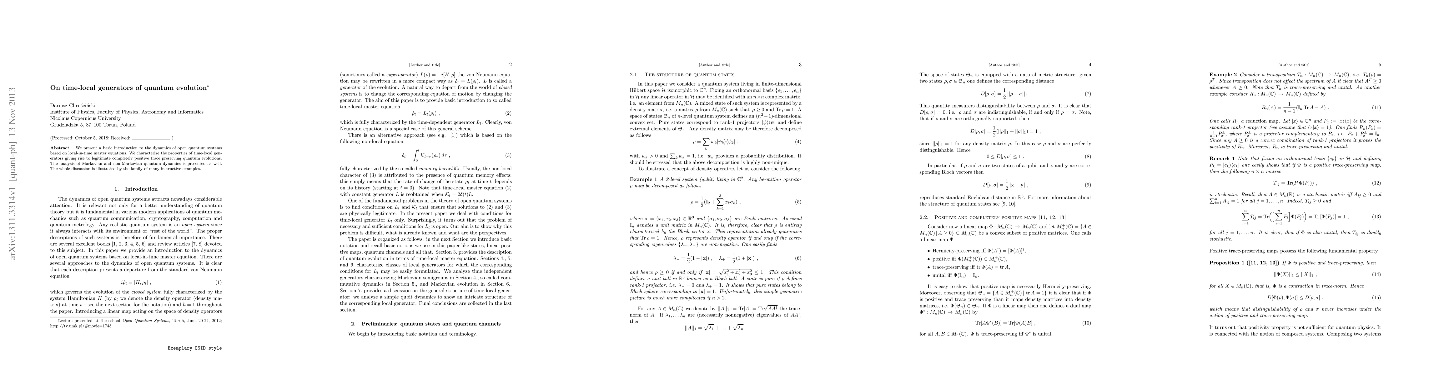 We present a basic introduction to the dynamics of open quantum systems based on local-in-time master equations. We characterize the properties of time-local generators giving rise to legitimate completely positive trace preserving quantum evolutions. The analysis of Markovian and non-Markovian quantum dynamics is presented as well. The whole discussion is illustrated by the family of many instructive examples.