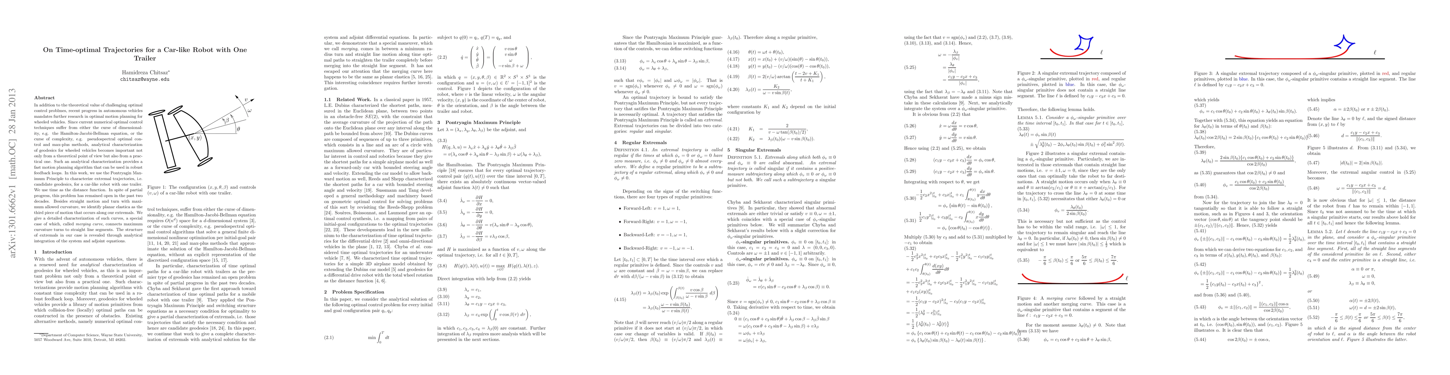 In addition to the theoretical value of challenging optimal control problmes, recent progress in autonomous vehicles mandates further research in optimal motion planning for wheeled vehicles. Since current numerical optimal control techniques suffer from either the curse of dimens ionality, e.g. the Hamilton-Jacobi-Bellman equation, or the curse of complexity, e.g. pseudospectral optimal control and max-plus methods, analytical characterization of geodesics for wheeled vehicles becomes important not only from a theoretical point of view but also from a prac tical one. Such an analytical characterization provides a fast motion planning algorithm that can be used in robust feedback loops. In this work, we use the Pontryagin Maximum Principle to characterize extremal trajectories, i.e. candidate geodesics, for a car-like robot with one trailer. We use time as the distance function. In spite of partial progress, this problem has remained open in the past two decades. Besides straight motion and turn with maximum allowed curvature, we identify planar elastica as the third piece of motion that occurs along our extr emals. We give a detailed characterization of such curves, a special case of which, called \emph{merging curve}, connects maximum curvature turns to straight line segments. The structure of extremals in our case is revealed through analytical integration of the system and adjoint equations.