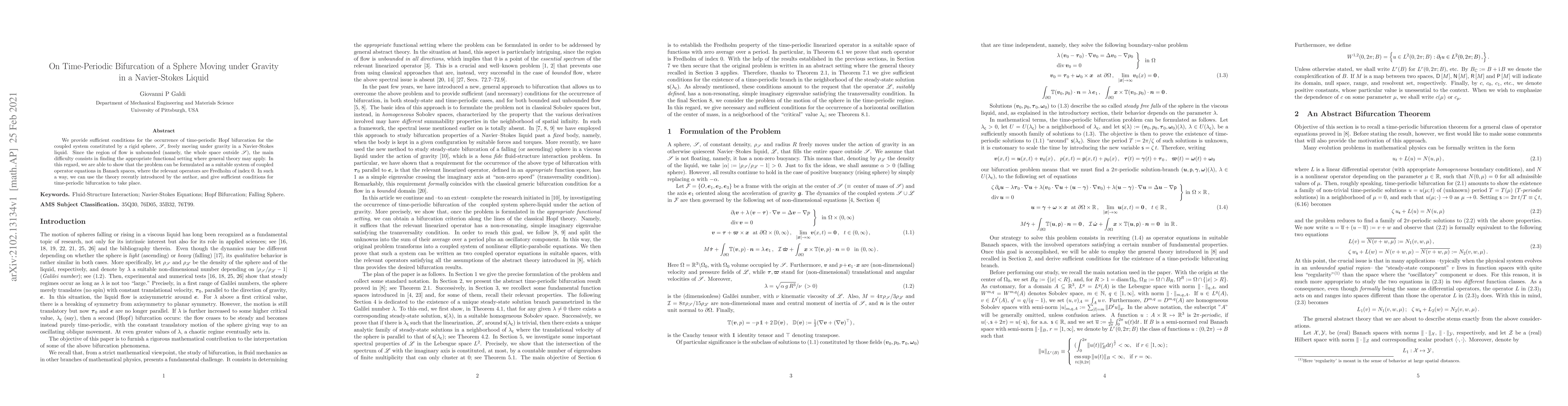 We provide sufficient conditions for the occurrence of time-periodic Hopf bifurcation for the coupled system constituted by a rigid sphere, $\mathscr S$, freely moving under gravity in a Navier-Stokes liquid. Since the region of flow is unbounded (namely, the whole space outside $\mathscr S$), the main difficulty consists in finding the appropriate functional setting where general theory may apply. In this regard, we are able to show that the problem can be formulated as a suitable system of coupled operator equations in Banach spaces, where the relevant operators are Fredholm of index 0. In such a way, we can use the theory recently introduced by the author, and give sufficient conditions for time-periodic bifurcation to take place.