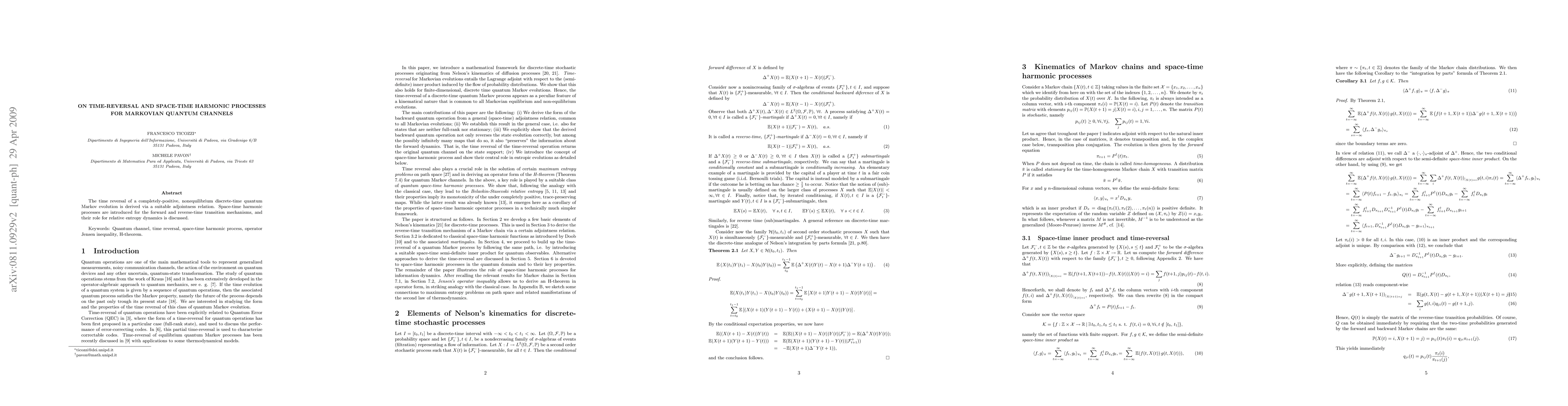 The time reversal of a completely-positive, nonequilibrium discrete-time quantum Markov evolution is derived via a suitable adjointness relation. Space-time harmonic processes are introduced for the forward and reverse-time transition mechanisms, and their role for relative entropy dynamics is discussed.