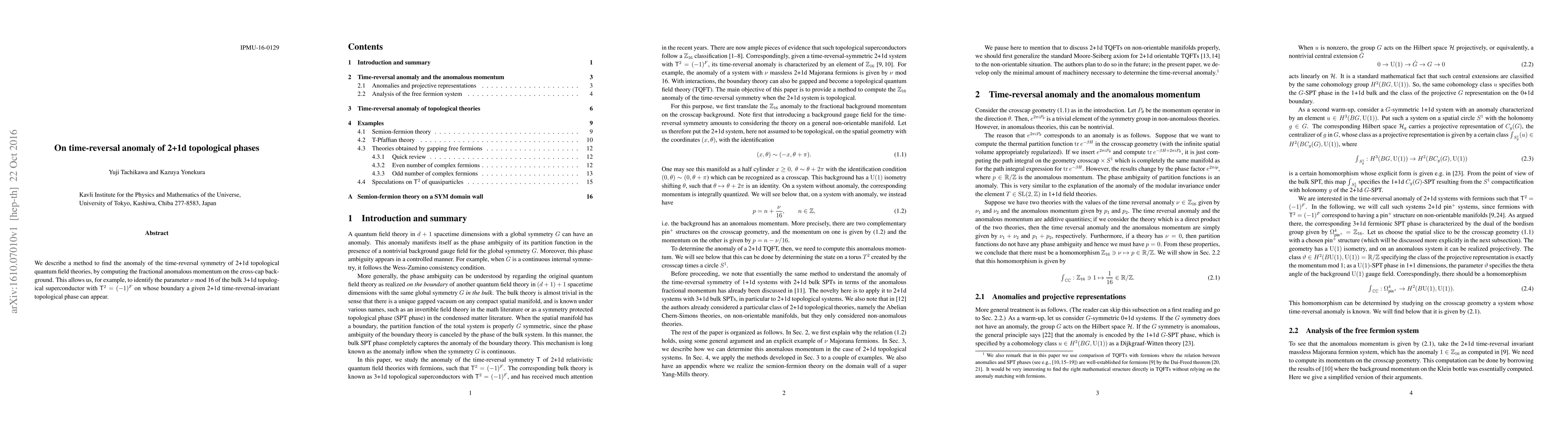 The paper proposes a method to compute the time-reversal symmetry anomaly in 2+1d topological quantum field theories by analyzing fractional anomalous momentum on a cross-cap background. This technique can determine the parameter $\nu$ mod 16 for 3+1d topological superconductors, identifying possible 2+1d boundary phases.