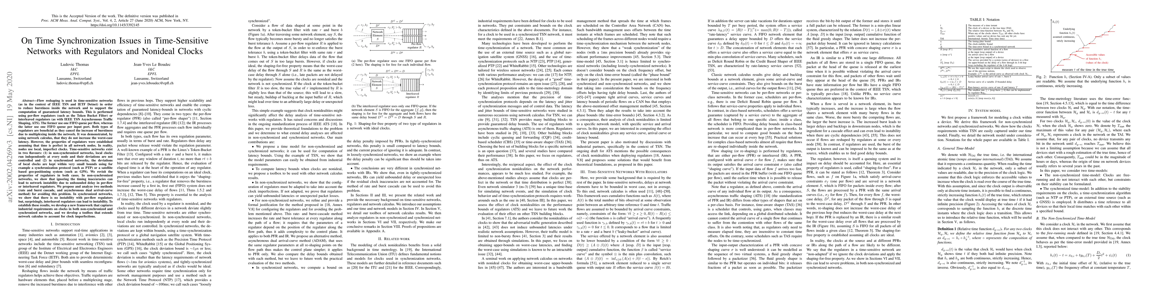 This paper investigates time synchronization issues in time-sensitive networks using regulators to manage burstiness and latency. It reveals that nonideal clocks can cause instability in non-synchronized networks, proposing two methods to mitigate this, while synchronized networks can face instability with interleaved regulators despite stable per-flow regulators.