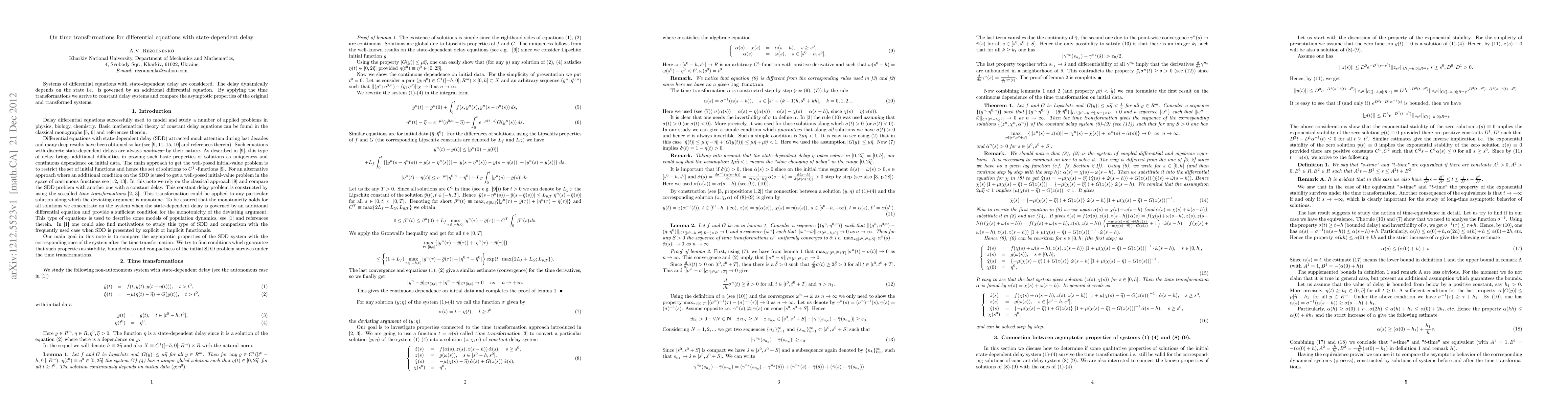 This paper investigates differential equations with state-dependent delays, transforming them using time transformations to systems with constant delays. It compares the asymptotic properties of the original and transformed systems.