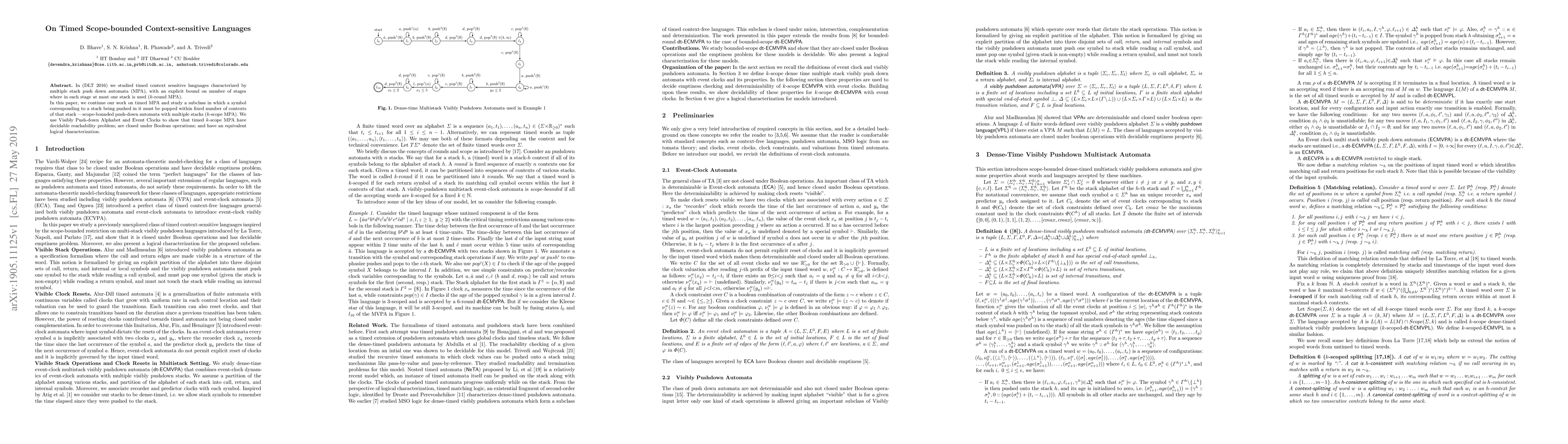 In (DLT 2016) we studied timed context sensitive languages characterized by multiple stack push down automata (MPA), with an explicit bound on number of stages where in each stage at most one stack is used (k-round MPA). In this paper, we continue our work on timed MPA and study a subclass in which a symbol corresponding to a stack being pushed in it must be popped within fixed number of contexts of that stack---scope-bounded push-down automata with multiple stacks (k-scope MPA). We use Visibly Push-down Alphabet and Event Clocks to show that timed k-scope MPA have decidable reachability problem; are closed under Boolean operations; and have an equivalent logical characterization.