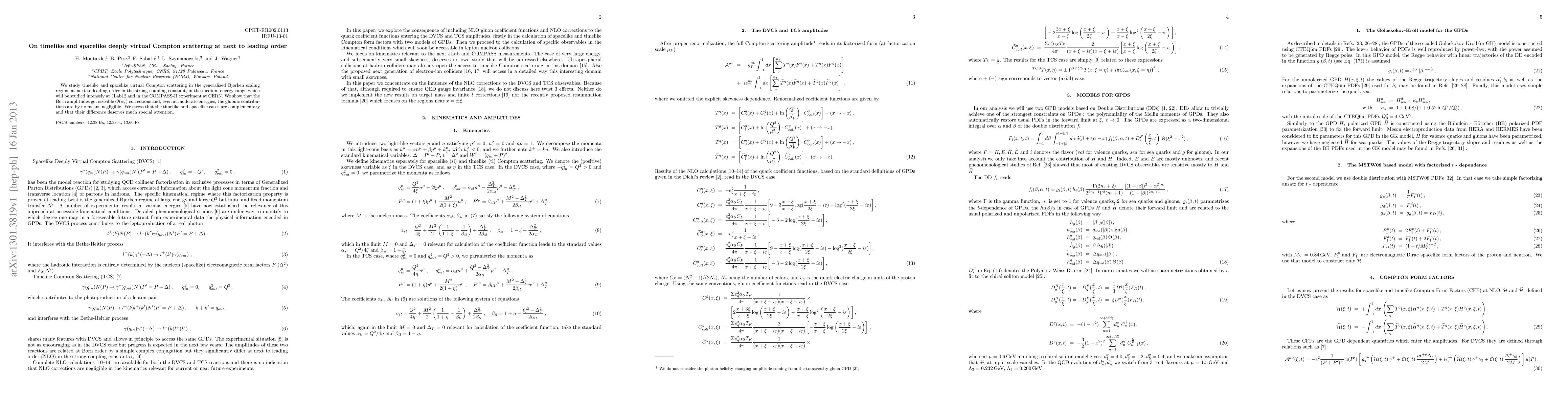 This paper investigates timelike and spacelike deeply virtual Compton scattering at next to leading order, revealing significant O(α_s) corrections to Born amplitudes and emphasizing the importance of gluonic contributions. It highlights the complementary nature of timelike and spacelike cases and underscores their distinct significance in experimental studies at JLab12 and COMPASS-II.