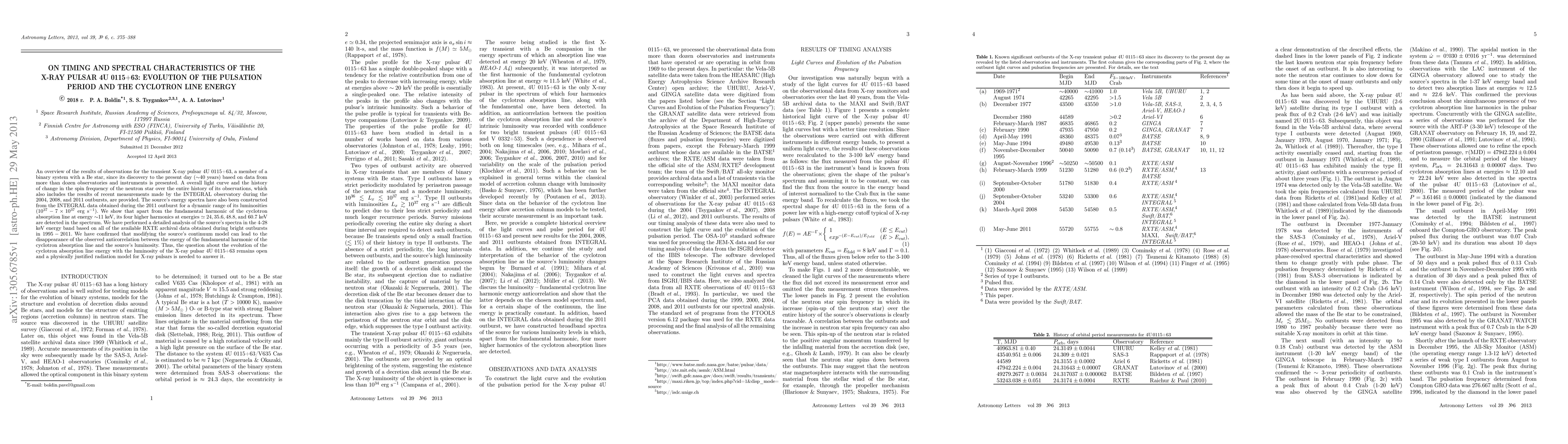 An overview of the results of observations for the transient X-ray pulsar 4U 0115+63, a member of a binary system with a Be star, since its discovery to the present day (~40 years) based on data from more than dozen observatories and instruments is presented. A overall light curve and the history of change in the spin frequency of the neutron star over the entire history of its observations, which also includes the results of recent measurements made by the INTEGRAL observatory during the 2004, 2008, and 2011 outbursts, are provided. The source's energy spectra have also been constructed from the INTEGRAL data obtained during the 2011 outburst for a dynamic range of its luminosities (~10^{37} - 7 x 10^{37} erg/s). We show that apart from the fundamental harmonic of the cyclotron absorption line at energy ~11 keV, its four higher harmonics at energies ~24, 35.6, 48.8, and 60.7 keV are detected in the spectrum. We have performed a detailed analysis of the source's spectra in the 4-28 keV energy band based on all of the available RXTE archival data obtained during bright outbursts in 1995-2011. We have confirmed that modifying the source's continuum model can lead to the disappearance of the observed anticorrelation between the energy of the fundamental harmonic of the cyclotron absorption line and the source's luminosity. Thus, the question about the evolution of the cyclotron absorption line energy with the luminosity of the X-ray pulsar 4U 0115+63 remains open and a physically justified radiation model for X-ray pulsars is needed to answer it.