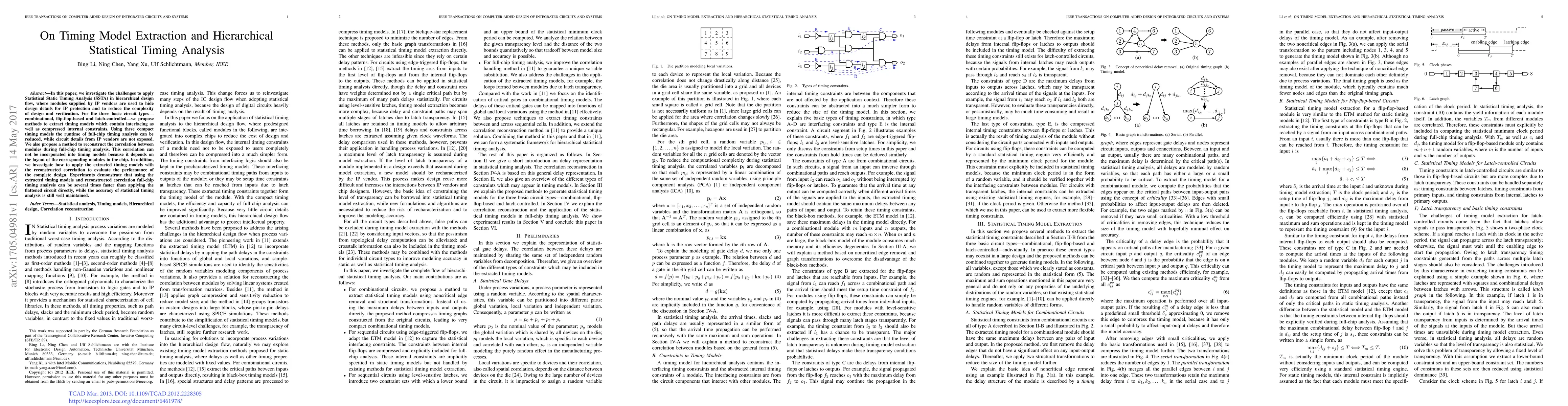 This paper proposes methods for extracting timing models for hierarchical designs, enabling faster Statistical Static Timing Analysis (SSTA) without exposing IP vendor details. It also introduces a technique to reconstruct module correlations during full-chip analysis, demonstrating significant speedups with maintained accuracy.
