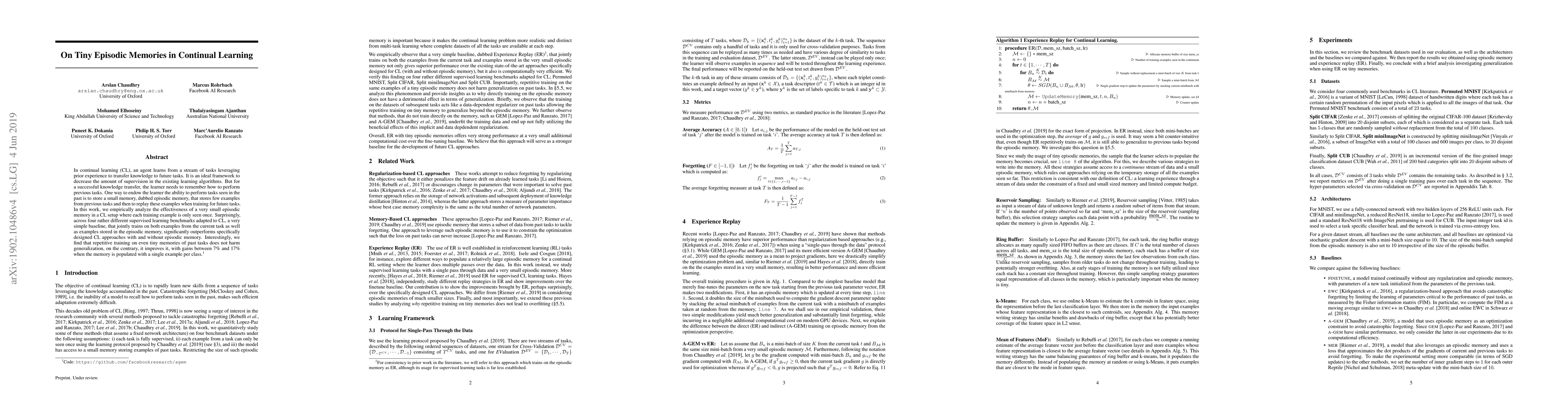 In continual learning (CL), an agent learns from a stream of tasks leveraging prior experience to transfer knowledge to future tasks. It is an ideal framework to decrease the amount of supervision in the existing learning algorithms. But for a successful knowledge transfer, the learner needs to remember how to perform previous tasks. One way to endow the learner the ability to perform tasks seen in the past is to store a small memory, dubbed episodic memory, that stores few examples from previous tasks and then to replay these examples when training for future tasks. In this work, we empirically analyze the effectiveness of a very small episodic memory in a CL setup where each training example is only seen once. Surprisingly, across four rather different supervised learning benchmarks adapted to CL, a very simple baseline, that jointly trains on both examples from the current task as well as examples stored in the episodic memory, significantly outperforms specifically designed CL approaches with and without episodic memory. Interestingly, we find that repetitive training on even tiny memories of past tasks does not harm generalization, on the contrary, it improves it, with gains between 7\% and 17\% when the memory is populated with a single example per class.