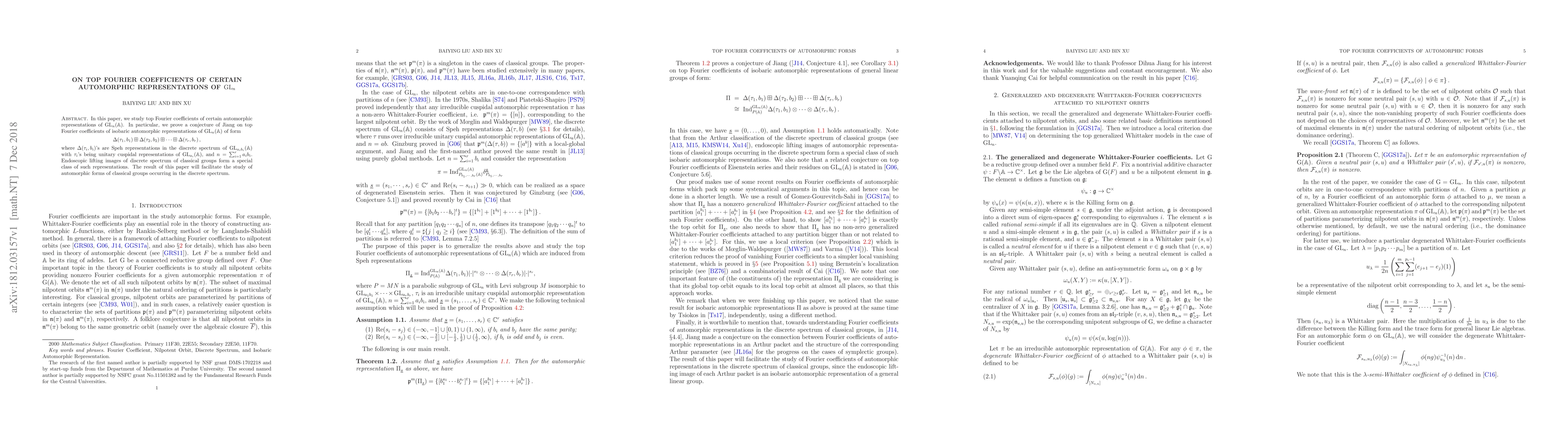 In this paper, we study top Fourier coefficients of certain automorphic representations of $\mathrm{GL}_n(\mathbb{A})$. In particular, we prove a conjecture of Jiang on top Fourier coefficients of isobaric automorphic representations of $\mathrm{GL}_n(\mathbb{A})$ of form $$ \Delta(\tau_1, b_1) \boxplus \Delta(\tau_2, b_2) \boxplus \cdots \boxplus \Delta(\tau_r, b_r)\,, $$ where $\Delta(\tau_i,b_i)$'s are Speh representations in the discrete spectrum of $\mathrm{GL}_{a_ib_i}(\mathbb{A})$ with $\tau_i$'s being unitary cuspidal representations of $\mathrm{GL}_{a_i}(\mathbb{A})$, and $n = \sum_{i=1}^r a_ib_i$. Endoscopic lifting images of the discrete spectrum of classical groups form a special class of such representations. The result of this paper will facilitate the study of automorphic forms of classical groups occurring in the discrete spectrum.