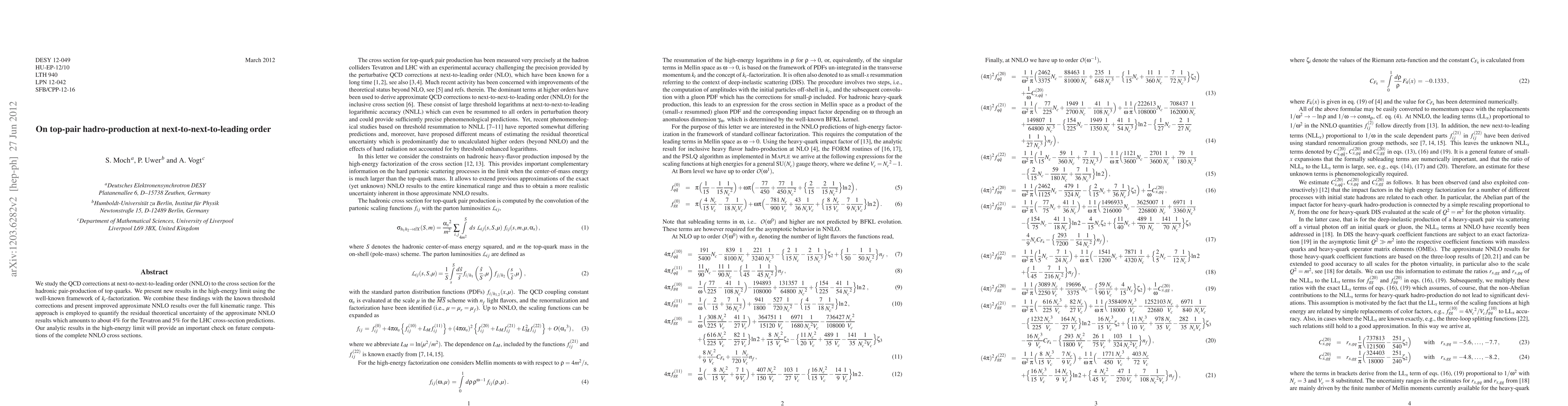 This paper presents new QCD corrections at next-to-next-to-leading order (NNLO) to the cross section for top-pair hadro-production, utilizing k_t-factorization and combining these with known threshold corrections. The study aims to quantify theoretical uncertainties, achieving about 4% for Tevatron and 5% for LHC predictions, and provides an analytic check for future complete NNLO computations.
