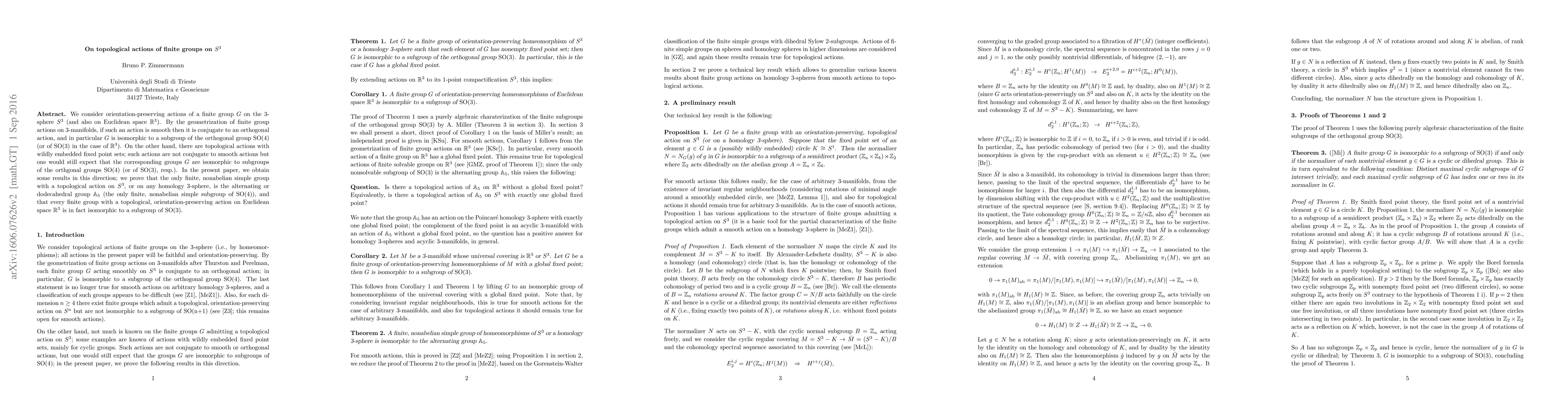 This paper investigates topological actions of finite groups on the 3-sphere S^3 and Euclidean space R^3, showing that such actions are often conjugate to orthogonal actions. The authors demonstrate that the only nonabelian simple group with a topological action on S^3 is A_5, and every finite group with a topological action on R^3 is isomorphic to a subgroup of SO(3).