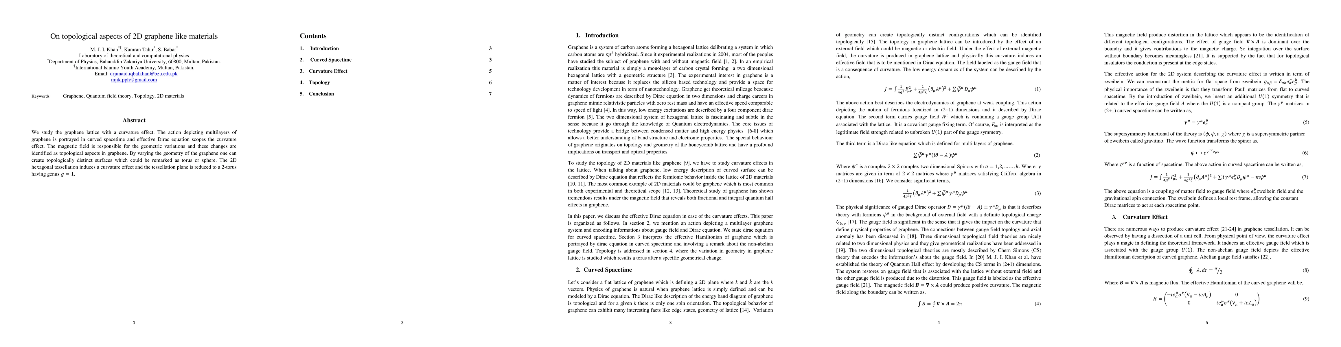 We study the graphene lattice with a curvature effect. The action depicting multilayers of graphene is portrayed in curved spacetime and effective Dirac equation scopes the curvature effect. The magnetic field is responsible for the geometric variations and these changes are identified as topological aspects in graphene. By varying the geometry of the graphene one can create topologically distinct surfaces which could be remarked as torus or sphere. The 2D hexagonal tessellation induces a curvature effect and the tessellation plane is reduced to a 2-torus having genus g=1.