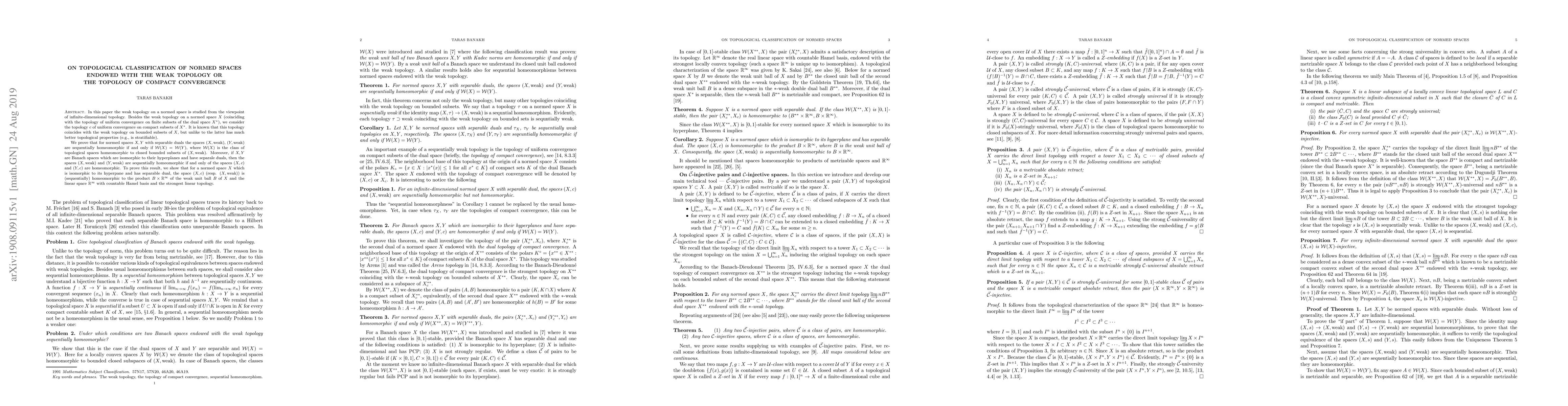 In this paper the weak topology on a normed space is studied from the viewpoint of infinite-dimensional topology. Besides the weak topology on a normed space $X$ (coinciding with the topology of uniform convergence on finite subsets of the dual space $X^*$), we consider the topology $c$ of uniform convergence on compact subsets of $X^*$. It is known that this topology coincides with the weak topology on bounded subsets of $X$, but unlike to the latter has much better topological properties (e.g., is stratifiable). We prove that for normed spaces $X,Y$ with separable duals the spaces $(X,weak)$, $(Y,weak)$ are sequentially homeomorphic if and only if $\mathcal W(X)=\mathcal W(Y)$, where $\mathcal W(X)$ is the class of topological spaces homeomorphic to closed bounded subsets of $(X,weak)$. Moreover, if $X,Y$ are Banach spaces which are isomorphic to their hyperplanes and have separale duals, then the spaces $(X,weak)$ and $(Y,weak)$ are sequentially homeomorphic if and only of the spaces $(X,c)$ and $(Y,c)$ are homeomorphic. To prove this result, we show that for a normed space $X$ which is isomorphic to its hyperpane and has separable dual, the space $(X,c)$ (resp. $(X,weak)$) is (sequentially) homeomorphic to the product $B\times\mathbb R^\infty$ of the weak unit ball $B$ of $X$ and the linear space $\mathbb R^\infty$ with countable Hamel basis and the strongest linear topology.