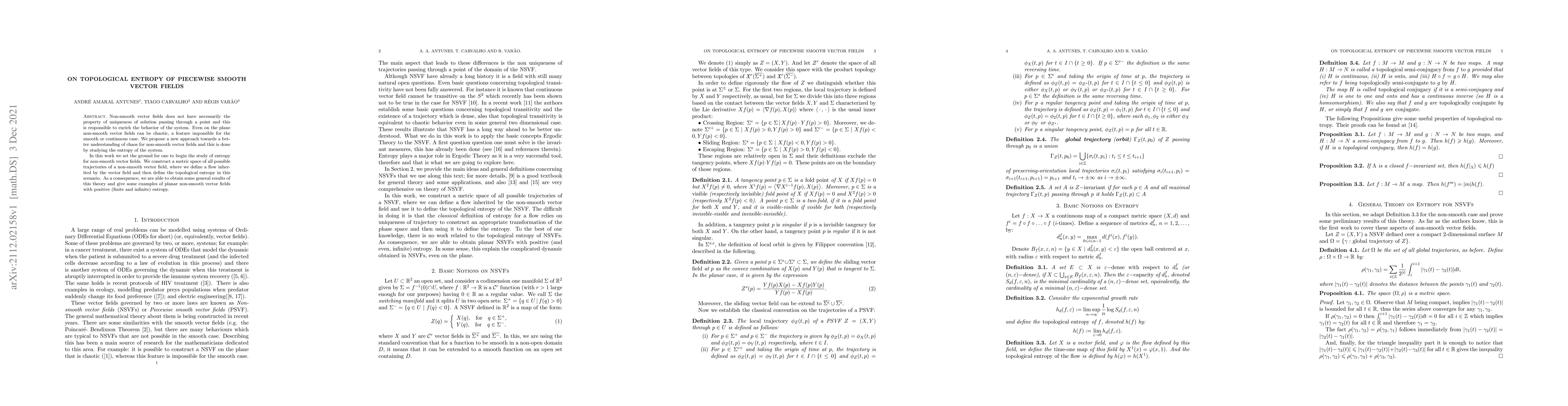 This paper introduces a new approach to understanding chaos in non-smooth vector fields by defining topological entropy, constructing a metric space of trajectories, and providing examples of planar non-smooth vector fields with both finite and infinite entropy. The study sets a foundation for further research into entropy in non-smooth dynamical systems.