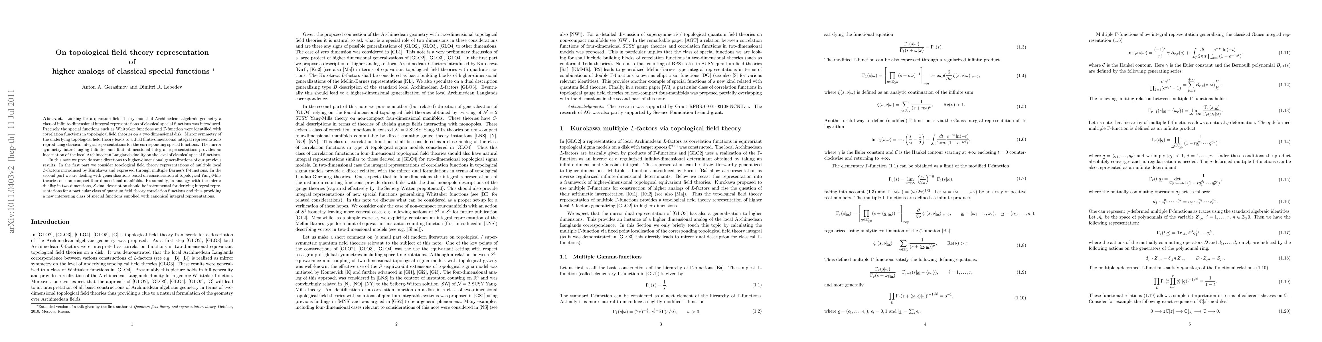 Looking for a quantum field theory model of Archimedean algebraic geometry a class of infinite-dimensional integral representations of classical special functions was introduced. Precisely the special functions such as Whittaker functions and Gamma-function were identified with correlation functions in topological field theories on a two-dimensional disk. Mirror symmetry of the underlying topological field theory leads to a dual finite-dimensional integral representations reproducing classical integral representations for the corresponding special functions. The mirror symmetry interchanging infinite- and finite-dimensional integral representations provides an incarnation of the local Archimedean Langlands duality on the level of classical special functions. In this note we provide some directions to higher-dimensional generalizations of our previous results. In the first part we consider topological field theory representations of multiple local L-factors introduced by Kurokawa and expressed through multiple Barnes's Gamma-functions. In the second part we are dealing with generalizations based on consideration of topological Yang-Mills theories on non-compact four-dimensional manifolds. Presumably, in analogy with the mirror duality in two-dimensions, S-dual description should be instrumental for deriving integral representations for a particular class of quantum field theory correlation functions and thus providing a new interesting class of special functions supplied with canonical integral representations.