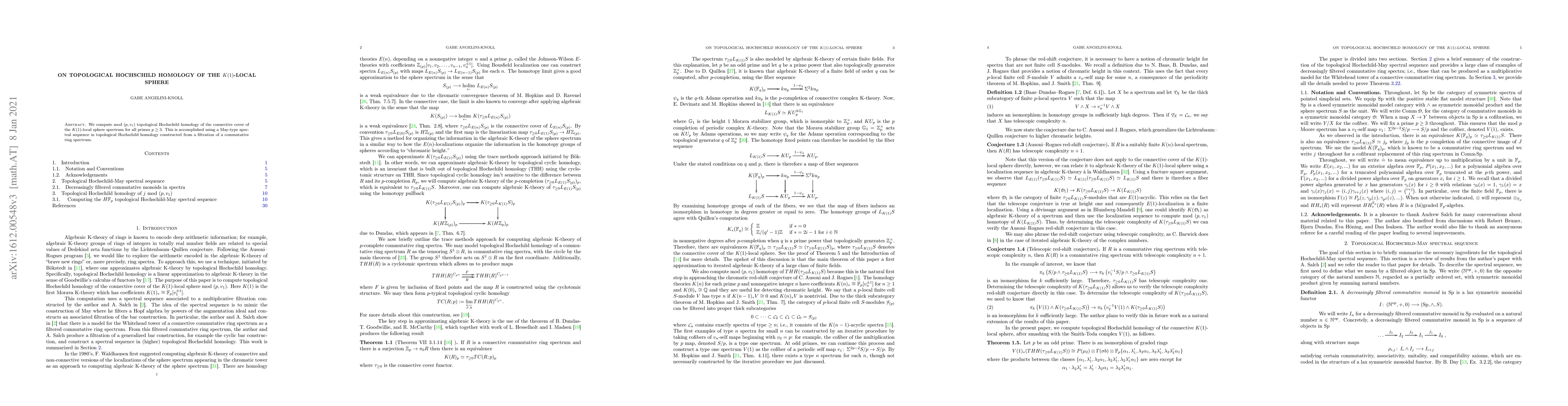 Summary: This paper calculates topological Hochschild homology for the connective cover of the $K(1)$-local sphere spectrum modulo $p$ and $v_1$ for primes $p\ge 3$, utilizing a May-type spectral sequence derived from a filtration of a commutative ring spectrum.