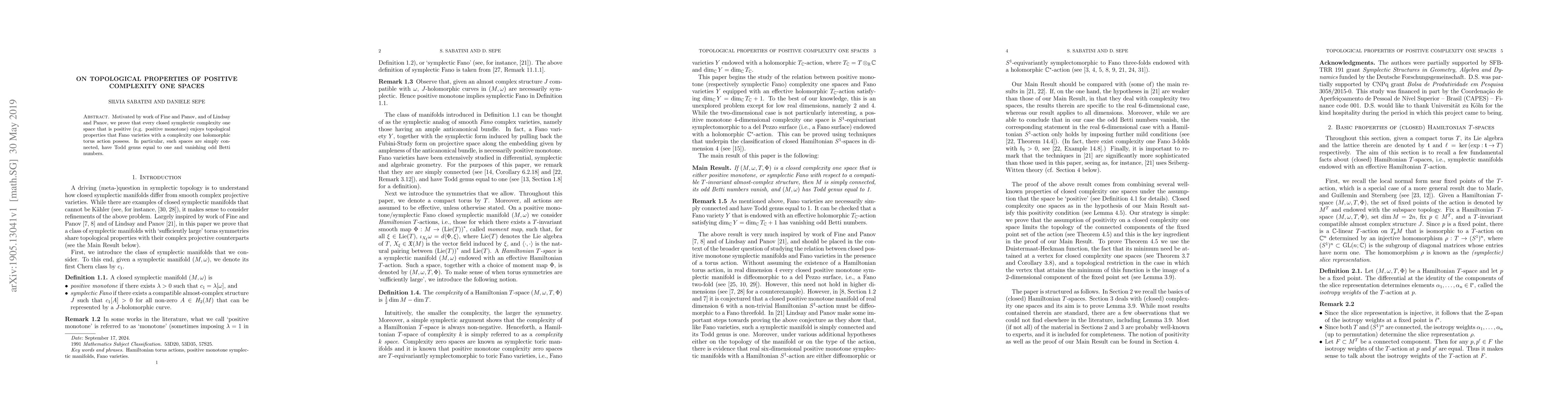 Motivated by work of Fine and Panov, and of Lindsay and Panov, we prove that every closed symplectic complexity one space that is positive (e.g. positive monotone) enjoys topological properties that Fano varieties with a complexity one holomorphic torus action possess. In particular, such spaces are simply connected, have Todd genus equal to one and vanishing odd Betti numbers.