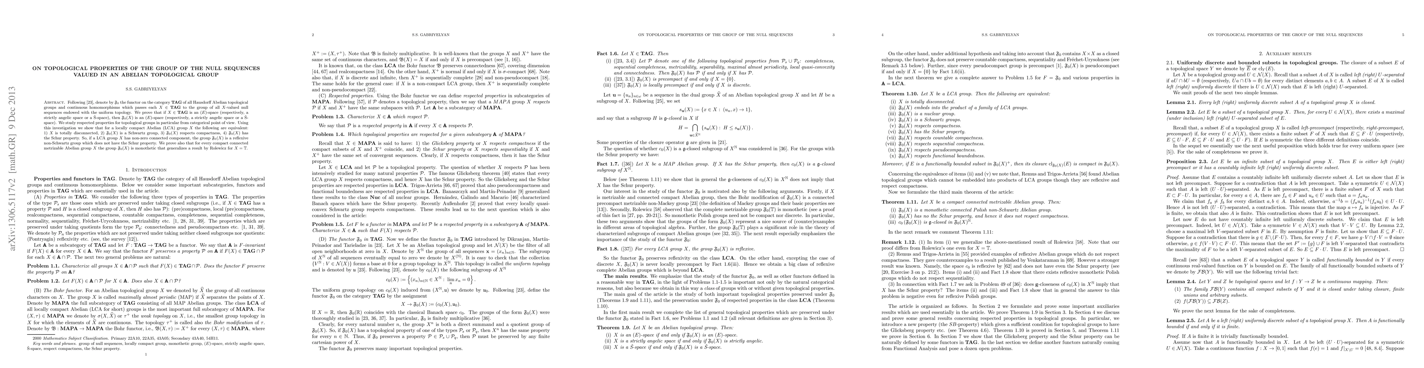 Following [23], denote by $\mathfrak{F}_0$ the functor on the category $\mathbf{TAG}$ of all Hausdorff Abelian topological groups and continuous homomorphisms which passes each $X\in \mathbf{TAG}$ to the group of all $X$-valued null sequences endowed with the uniform topology. We prove that if $X\in \mathbf{TAG}$ is an $(E)$-space (respectively, a strictly angelic space or a \v{S}-space), then $\mathfrak{F}_0 (X)$ is an $(E)$-space (respectively, a strictly angelic space or a \v{S}-space). We study respected properties for topological groups in particular from categorical point of view. Using this investigation we show that for a locally compact Abelian (LCA) group $X$ the following are equivalent: 1) $X$ is totally disconnected, 2) $\mathfrak{F}_0 (X)$ is a Schwartz group, 3) $\mathfrak{F}_0 (X)$ respects compactness, 4) $\mathfrak{F}_0(X)$ has the Schur property. So, if a LCA group $X$ has non-zero connected component, the group $\mathfrak{F}_0(X)$ is a reflexive non-Schwartz group which does not have the Schur property. We prove also that for every compact connected metrizable Abelian group $X$ the group $\mathfrak{F}_0 (X)$ is monothetic that generalizes a result by Rolewicz for $X=\mathbb{T}$.