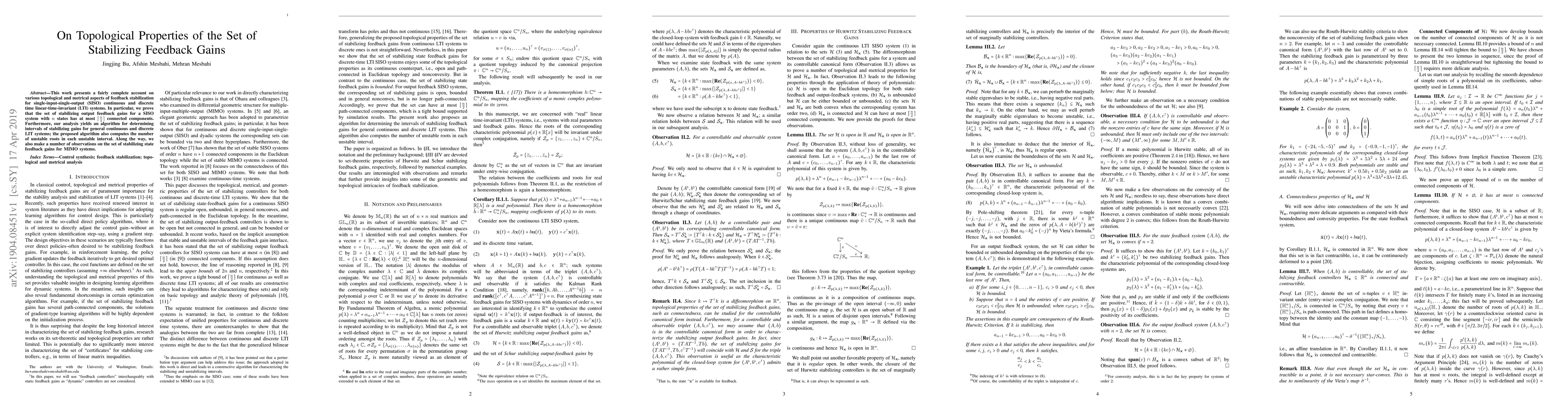 This paper investigates topological properties of the set of stabilizing feedback gains for SISO LTI systems, proving it has at most $\lceil{\frac{n}{2}}\rceil$ connected components, and proposes an algorithm to determine intervals of stabilizing gains and count unstable roots. It also makes observations on stabilizing state feedback gains for MIMO systems.
