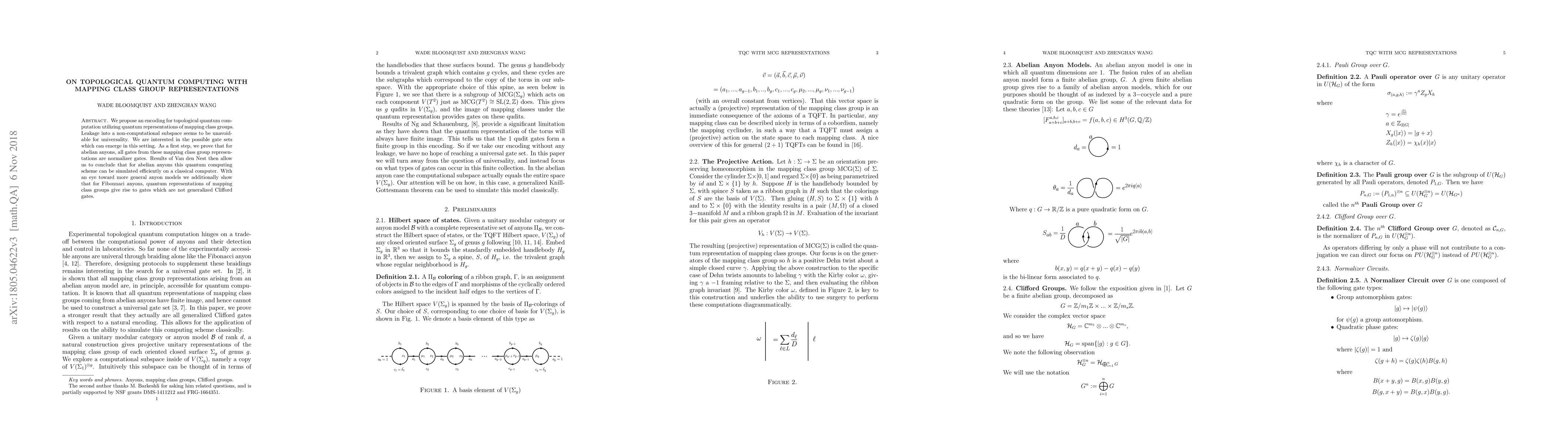 We propose an encoding for topological quantum computation utilizing quantum representations of mapping class groups. Leakage into a non-computational subspace seems to be unavoidable for universality in general. We are interested in the possible gate sets which can emerge in this setting. As a first step, we prove that for abelian anyons, all gates from these mapping class group representations are normalizer gates. Results of Van den Nest then allow us to conclude that for abelian anyons this quantum computing scheme can be simulated efficiently on a classical computer. With an eye toward more general anyon models we additionally show that for Fibonnaci anyons, quantum representations of mapping class groups give rise to gates which are not generalized Clifford gates.