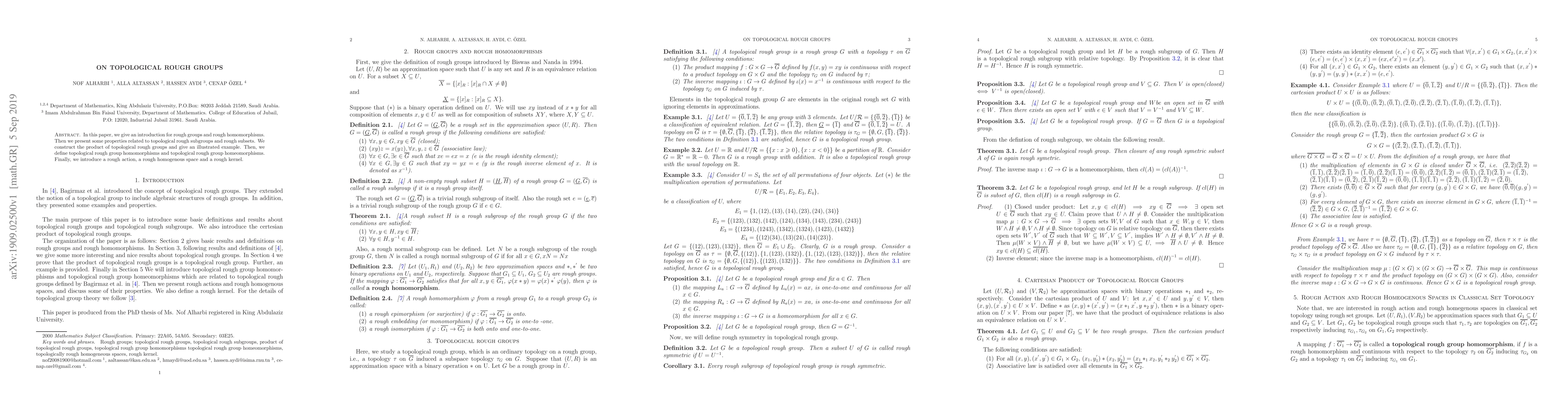 This paper introduces rough groups and homomorphisms, explores topological rough subgroups and subsets, constructs the product of topological rough groups, defines rough group homomorphisms and homeomorphisms, and introduces concepts like rough actions, rough homogeneous spaces, and rough kernels.