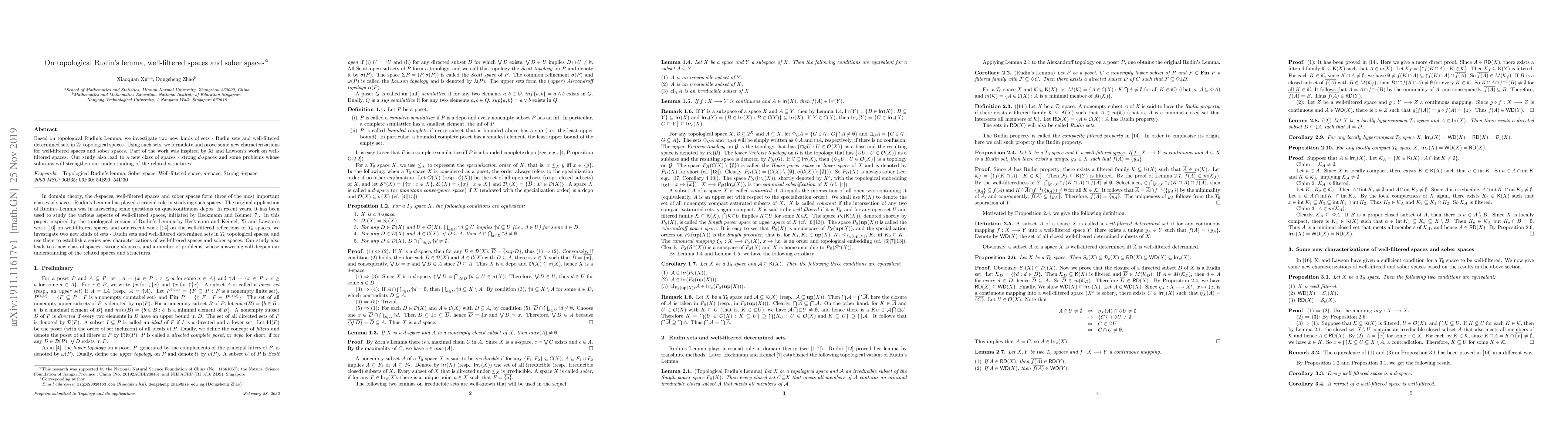 This paper explores topological Rudin's Lemma to define Rudin sets and well-filtered determined sets in $T_0$ spaces, leading to new characterizations for well-filtered and sober spaces. It introduces strong $d$-spaces and proposes problems to deepen understanding of these structures.