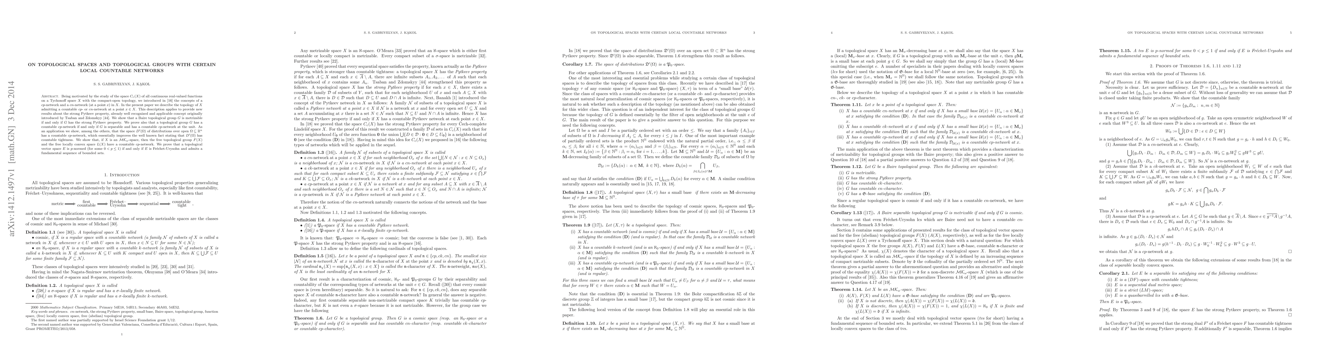 This paper explores topological spaces and groups with local countable networks, introducing concepts of cp- and cn-networks at a point in a space. It describes topologies admitting countable cp- or cn-networks at a point, and applies these to the strong Pytkeev property, showing a Baire topological group is metrizable if and only if it has this property. The study also demonstrates that a topological group has a countable cp-network if and only if it's separable and has a countable cp-network at the unit. The paper further reveals that the space of distributions D'(Omega) has a countable cp-network, and if X is an MK_ω-space, then the free topological group F(X) and the free locally convex space L(X) have a countable cp-network. Lastly, it proves that a topological vector space E is p-normed for some 0<p≤1 if and only if E is Fréchet-Urysohn and admits a fundamental sequence of bounded sets.