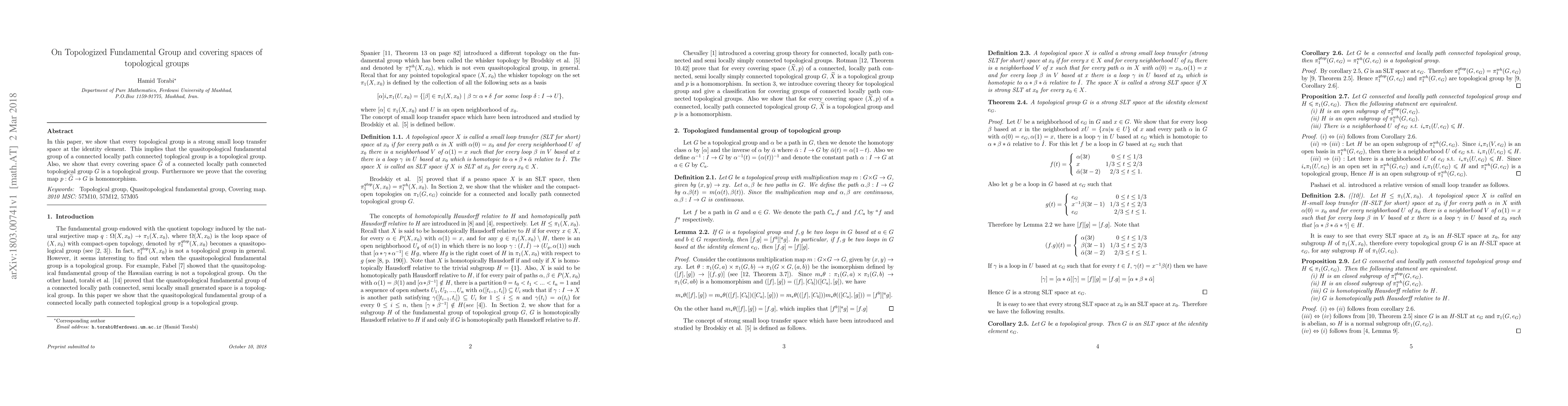 In this paper, we show that every topological group is a strong small loop transfer space at the identity element. This implies that the quasitopological fundamental group of a connected locally path connected topological group is a topological group. Also, we show that every covering space of a connected locally path connected topological group is a topological group and its covering map is homomorphism.