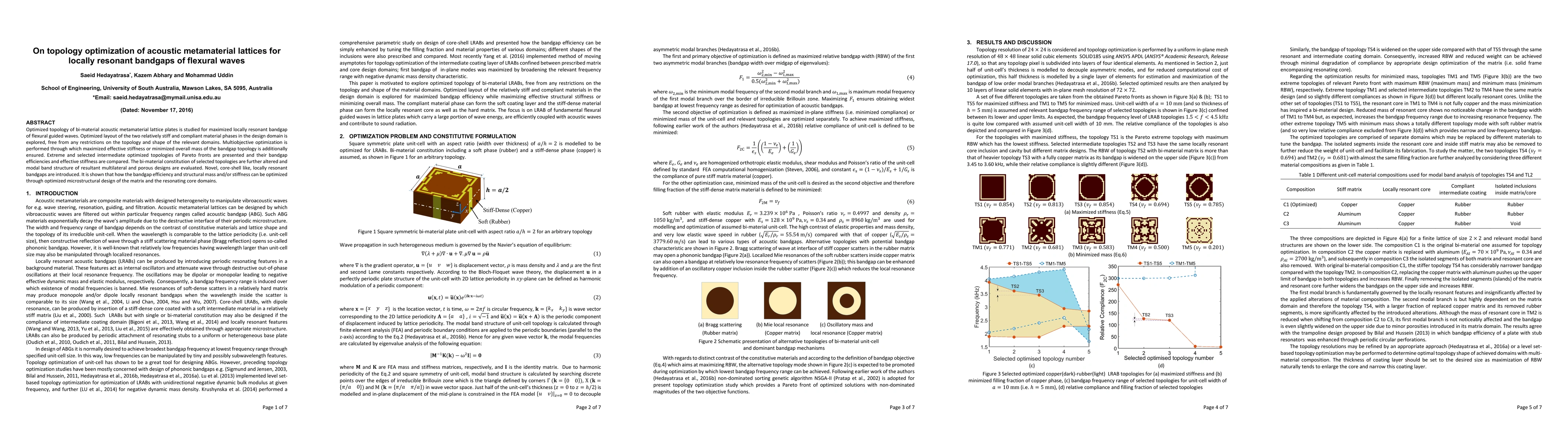 This paper explores the topology optimization of bi-material acoustic metamaterial lattices to maximize locally resonant bandgaps for flexural waves. The study presents optimized layouts that balance effective stiffness and minimal mass, introducing novel core-shell designs that enhance bandgap efficiency through tailored microstructural configurations.