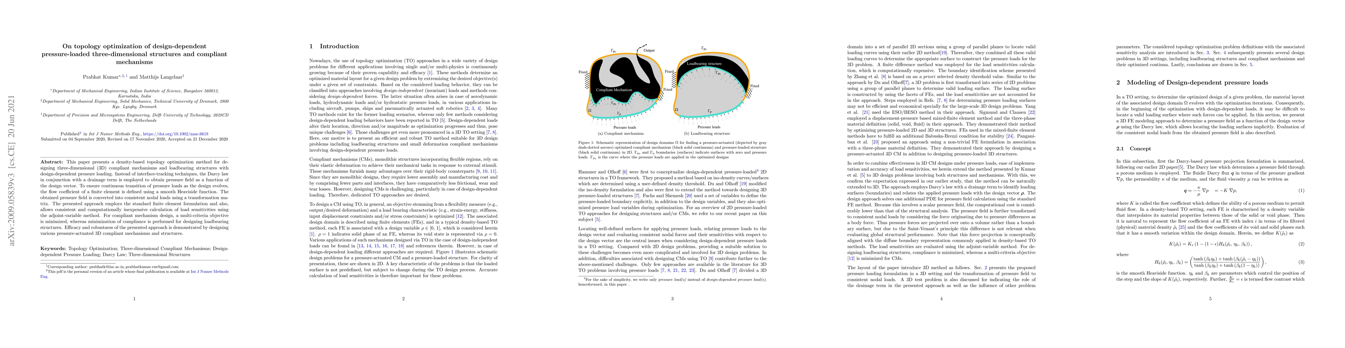 This paper introduces a density-based topology optimization method for designing 3D compliant mechanisms and loadbearing structures under design-dependent pressure loading, using the Darcy law and a smooth Heaviside function for pressure field computation. The method allows for efficient calculation of load sensitivities and demonstrates efficacy through various designs.