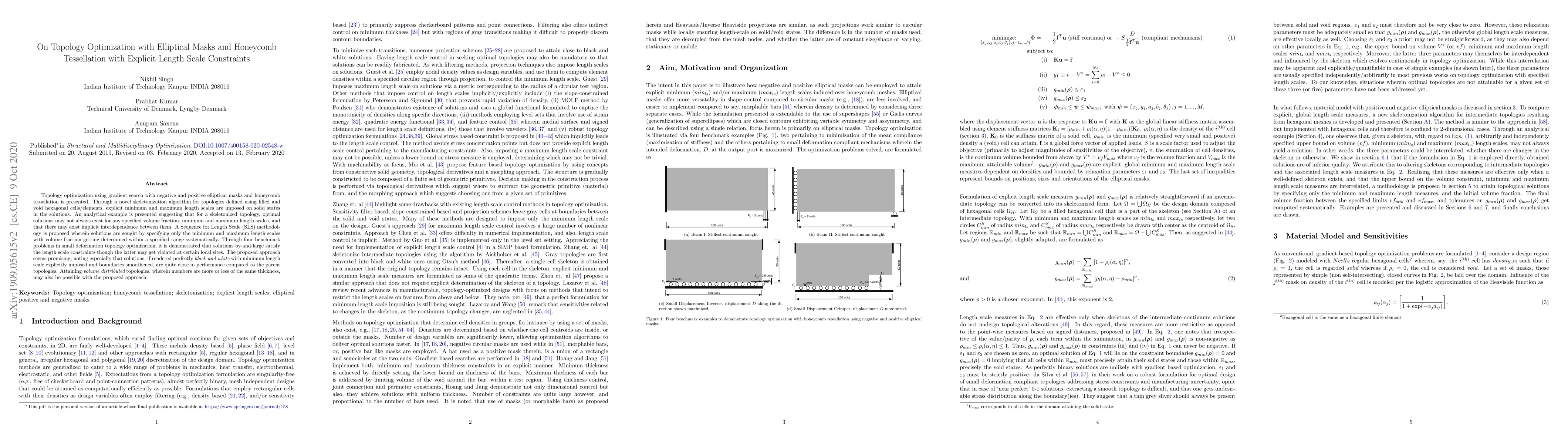 This paper presents a topology optimization method using elliptical masks and honeycomb tessellation with explicit length scale constraints. It proposes a novel skeletonization algorithm and a Sequence for Length Scale (SLS) methodology to systematically determine volume fraction while imposing length scales, demonstrating that optimal solutions may not always exist and local violations of length scales can occur.