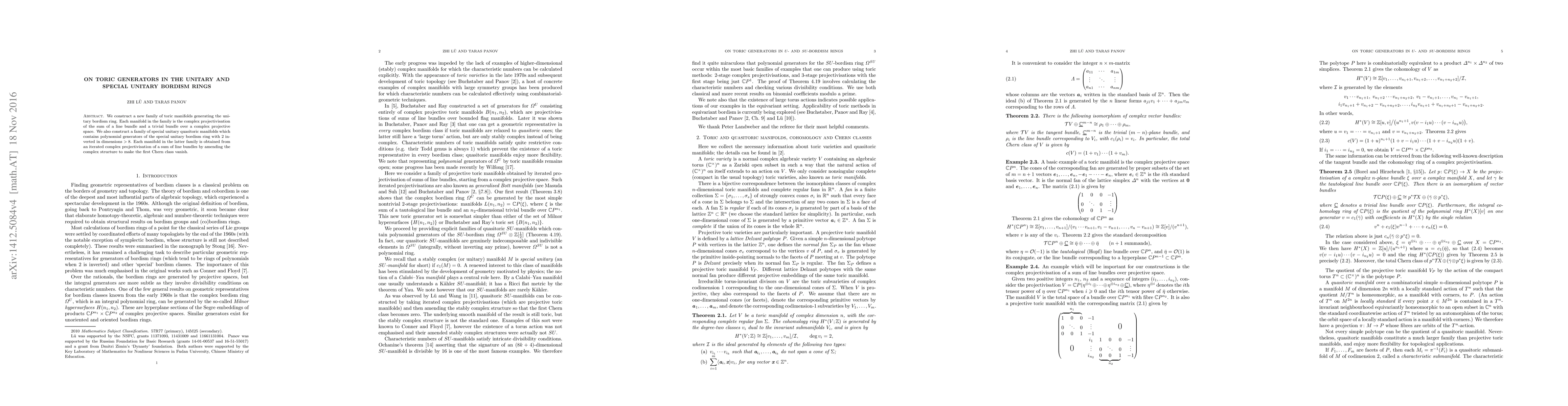 This paper introduces a new family of toric manifolds that generate the unitary bordism ring and constructs special unitary quasitoric manifolds that serve as polynomial generators for the special unitary bordism ring, with specific modifications to ensure vanishing first Chern classes in dimensions greater than 8.