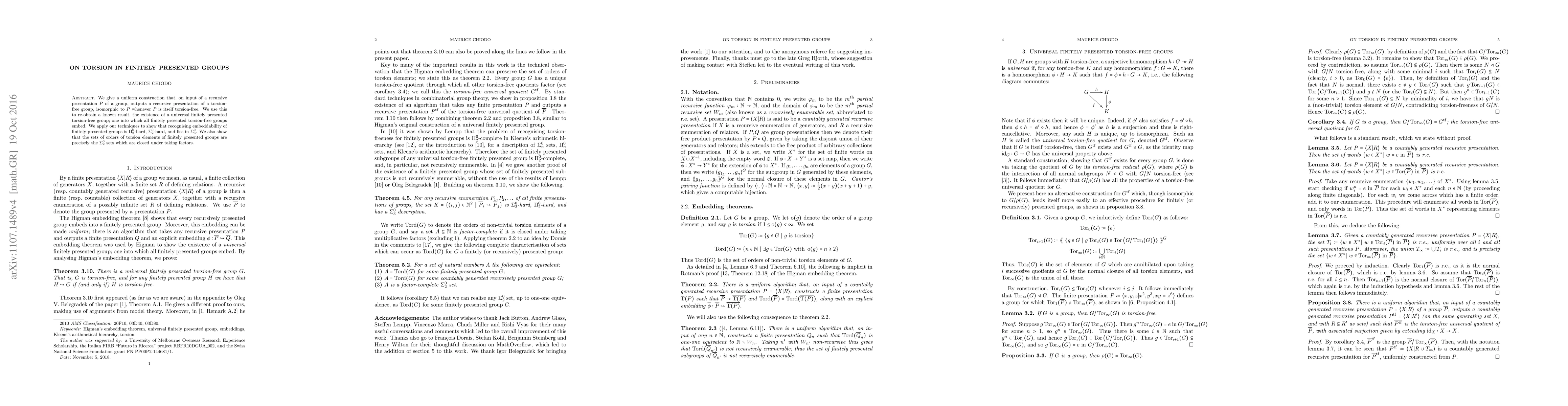 We give a uniform construction that, on input of a recursive presentation $P$ of a group, outputs a recursive presentation of a torsion-free group, isomorphic to $P$ whenever $P$ is itself torsion-free. We use this to re-obtain a known result, the existence of a universal finitely presented torsion-free group; one into which all finitely presented torsion-free groups embed. We apply our techniques to show that recognising embeddability of finitely presented groups is $\Pi^{0}_{2}$-hard, $\Sigma^{0}_{2}$-hard, and lies in $\Sigma^{0}_{3}$. We also show that the sets of orders of torsion elements of finitely presented groups are precisely the $\Sigma^{0}_{2}$ sets which are closed under taking factors.